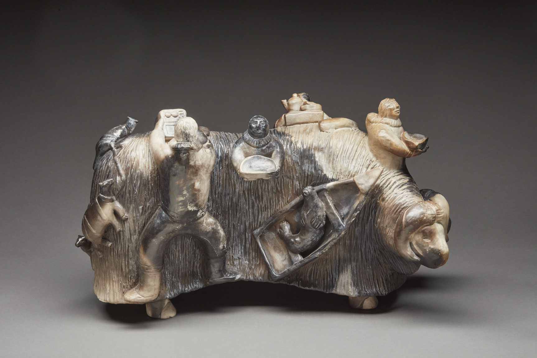 Earthlings, an exhibition at the Esker Foundation, Calgary, Alberta, offered a collection of autobiographical, autoethnographical, imaginative, and engaged ceramic sculptures and works on paper. Artist Shary Boyle used the concept of “bridge art” to frame Earthlings, which highlighted her collaborations with seven Inuit artists: Roger Aksadjuak, Shuvinai Ashoona, Pierre Aupilardjuk, Jessie Kenalogak, John Kurok, and Leo Napayok.