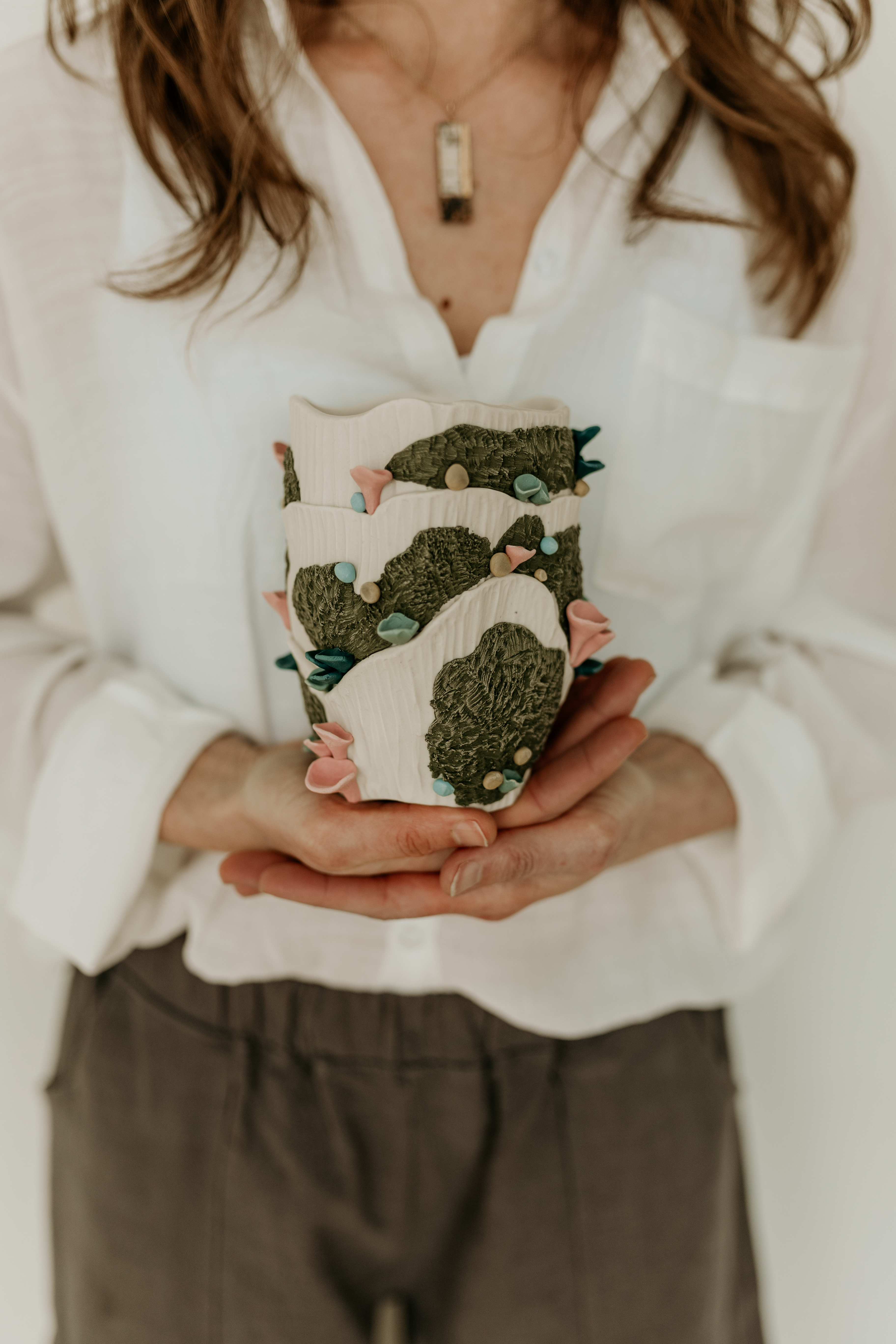 When asked to reflect on her experience, Katie shared, "The Journey at Adamah was just incredible. The fact that it is so immersive and supportive in nature and structure that you just show up and don’t have to think about where you're going to eat or sleep or worry about traveling back and forth is just amazing. Our group is so close and supportive of one another." Katie continued, "I did not know where my pottery was going to go when I started this. Pottery is a selfish hobby for me. I am still definitely in a growth phase. Steven highlights that 'one’s journey is never done but ever going’, which is so true. What came out of this past year was my deep passion and love for nature. That’s why I love the trails at Adamah. There is so much inspiration on the property. The lichen, the moss, the fungi, and the mushrooms – it’s all right there. I am now using my pottery as a voice to make people interested in and aware of these small, beautiful elements in nature that are often overstepped or overlooked but are such an integral part of the whole ecosystem."