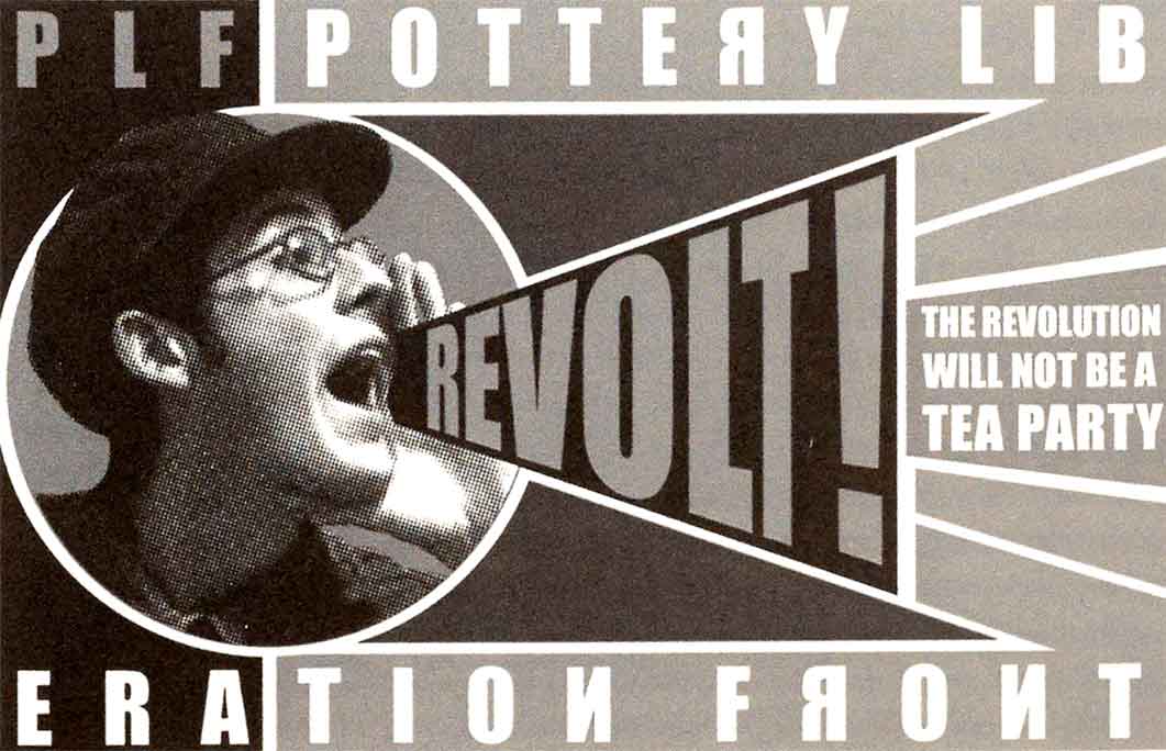 Ten years ago, Garth Johnson – then a grad student at Alfred University – made a propaganda-style sticker of himself shouting into a bullhorn, "Revolt! Pottery Liberation Front! The revolution will not be a tea party!" One of these stickers has been a touchstone for me since then, unstuck to any fixed object and coveted by many While Garth's message had more to do with pushing ceramics past a crusty mingei aesthetic, I saw it as a call to arms for handmade pots. The sticker catalyzed a major shift in my thinking; I realized how effective pop culture and grassroots activism could be in advancing the cause of handmade pots and expanding our audience for crafts. The sticker itself was compelling because it was funny, graphically beautiful, and unexpected. It struck me that making functional pots is a closed-loop system – that making is inseparable from using, and that if we could only get the word out, more people would love and use pots. Pots in use become reminders of human connections and even facilitators for relationships. Stickers like Garth's help bolster the idea of pots as objects that can ignite social change.