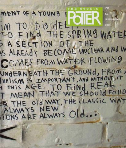 Clay & Words; Speaking Volumes: Pottery and Word by Paul Mathieu; Baraka: Blessings in Clay by Mary McWilliams; Becoming Inarticulate by Simon Levin; Think Nothing of It by Hayne Bayless; Vineet Kacker: Speaking in Clay Sutras by Jon Keenan; Rendering Text by Lucy Breslin; Words About Words by Forrest Snyder; Antislavery Ceramics 1787-1865 by Sam Margolin; One Hundred Bowls of Compassion by Cate Bourke; On Text and Clay by Holly Hanessian; A Kenzan Incense Burner by Louise Allison Cort; and more articles by Tom Spleth, Karen Theusen Massaro, Ian Anderson, Bill Hunt, Linda Christianson, Jim Romberg, Elspeth Owen, Alan Steinberg, Fred Taylor, Joy Bridy, and Theo Helmstadter. Also, remembering Mary Scheier.