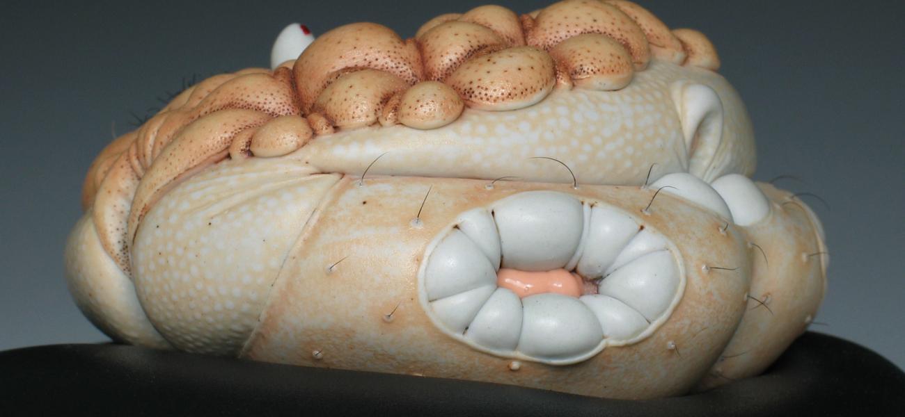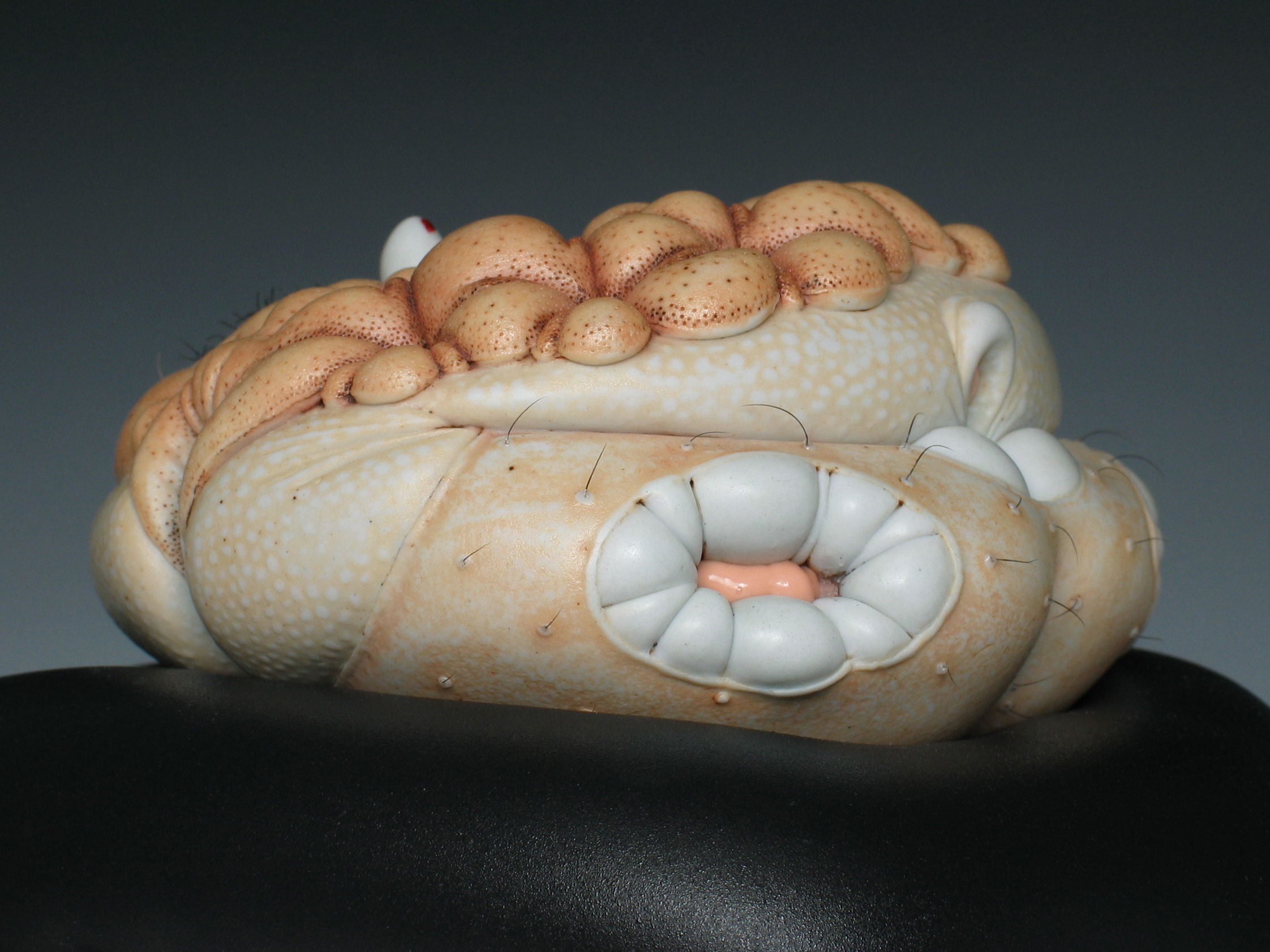 My love and fascination with Jason's work lie not only in the objects themselves but also in the context in which they exist. They are these beautiful, horrible, precious little babies artfully fabricated with the precision of a mad scientist/mother, whose logic is precise and definitive and known only to themselves. They are a childlike exploration into disgust, desire, and the fetishes that exist when these two polarized feelings come to overlap and exist on a continuum. The objects are pink and appear squishy, composed of orifices, nipples, follicles, all sorts of foldy-skin things. Some have neat, little tufting on their fleshy parts like a couch would, while others are tightly laced up. Most of them have hair purposefully plucked from the maker with maternal selflessness and attention. They are objects only a mother could love. In fact, at the end of describing his process during his lecture at New Paltz, Jason paused and said, "I have a real baby."