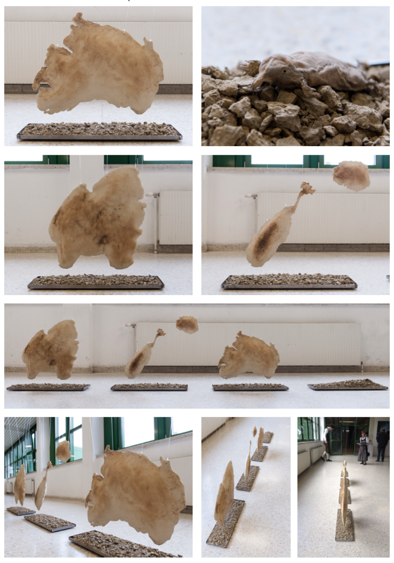 In Austria, I delved into the thin line between life and death, exploring the liminal space where a person has already died and the body is still warm, and connections between individuals transcend physical presence. Titled "Homunculus," the work consisted of slab-built clay bodies suspended with nylon, symbolizing the delicate balance between preservation and letting go. Inspired by aerial views while flying to Manhattan for my uncle's funeral, one of the family members who died, the shapes of the bodies echoed the geographical formations of isles and lakes. The big clay bodies are hung up with nylon with a small gap to the ground where I placed metal trays filled with loam I dug from my newly built home and a dead, dried-out mole, that my cat probably brought to the hot and dry attic, symbolized the earth – the ground.