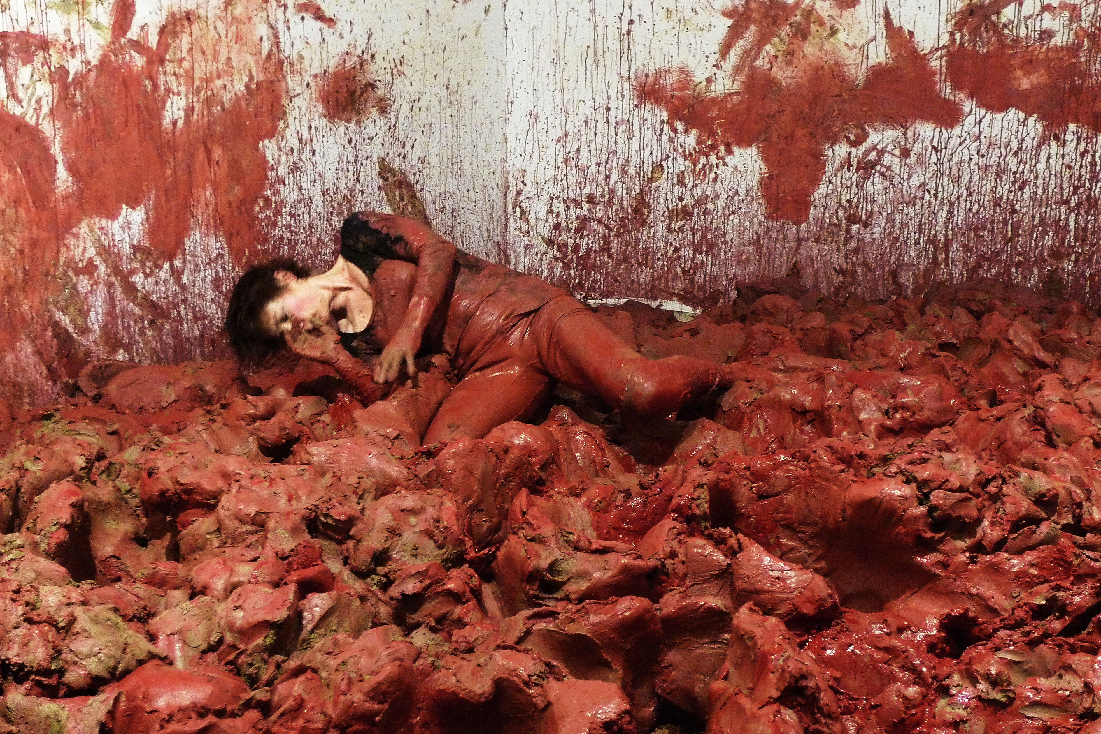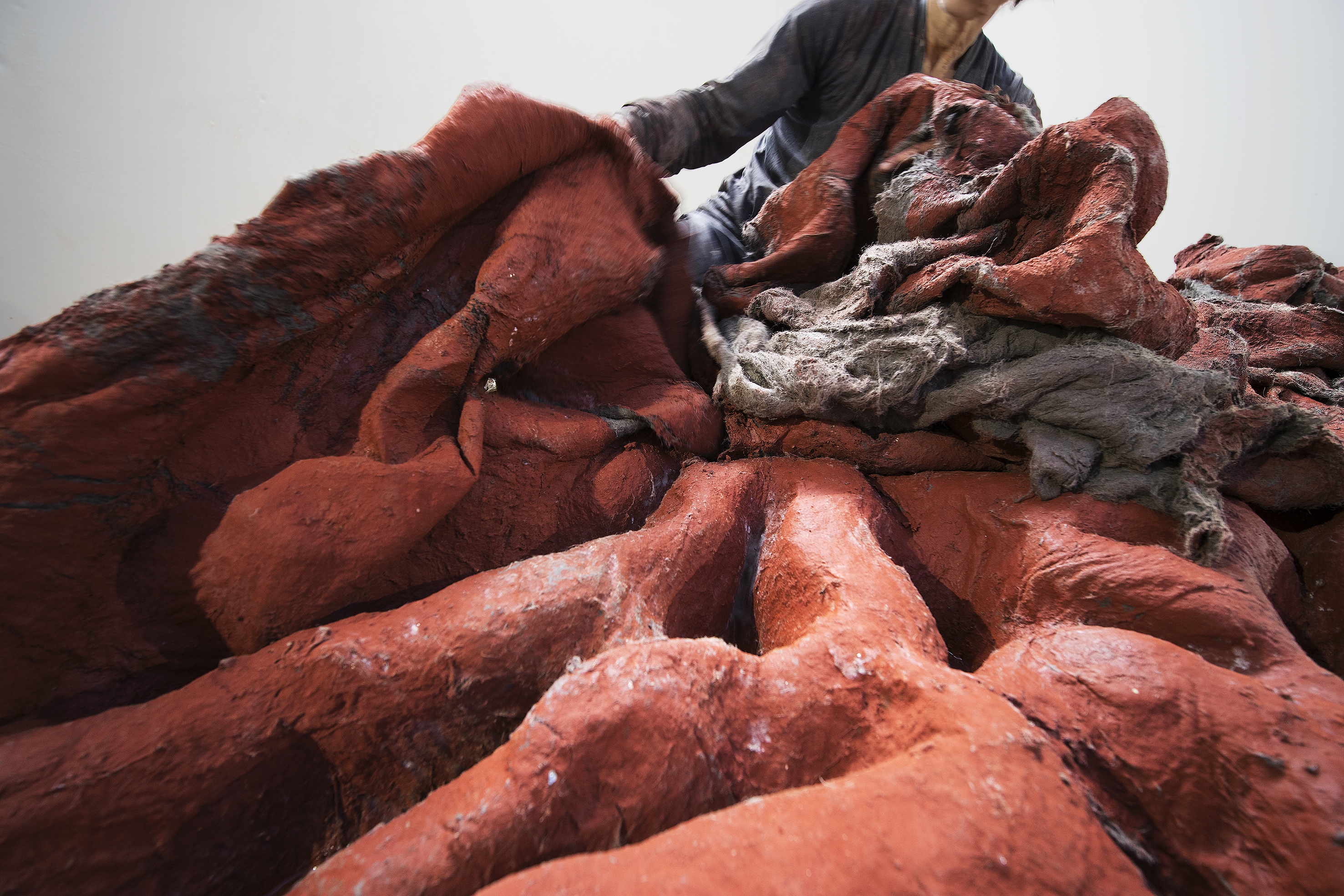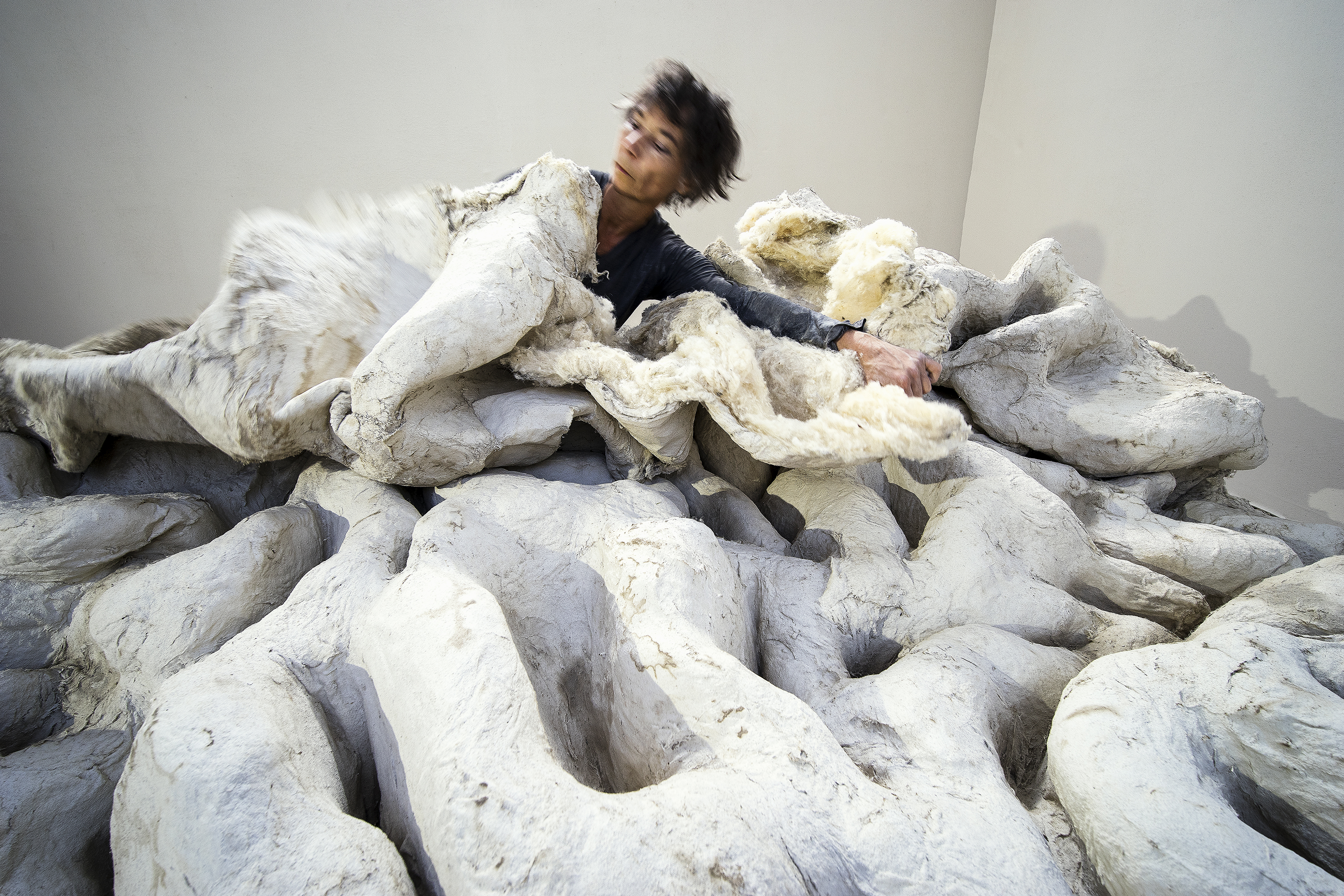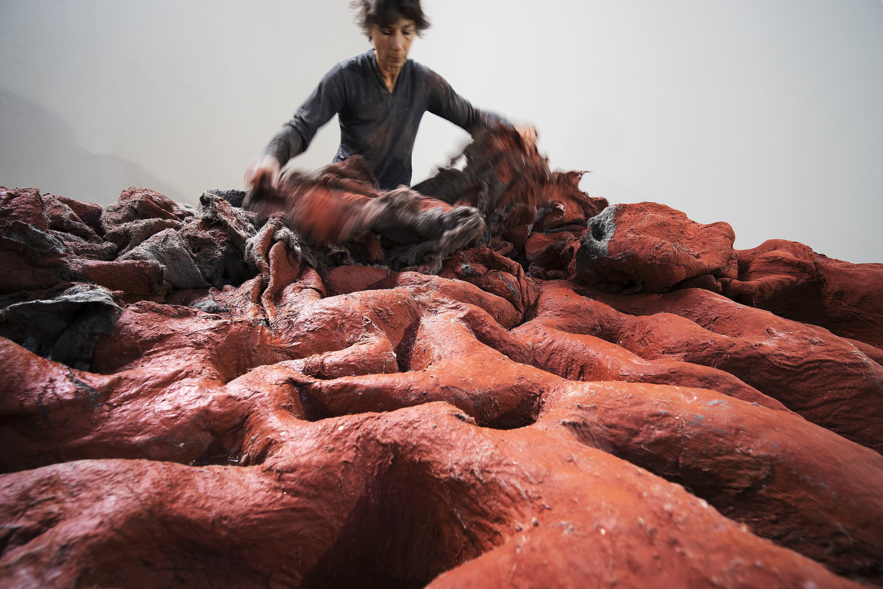 In January 2011, I brought eight tons of clay, straight from the riverbed, into the space of Gallery Punt WG in Amsterdam, the Netherlands. Kneading the earthy clay with my feet and using fabric to fold it like dough, I tried to make the material plastic, but it kept falling apart. This ripping and splitting of the material and the fabric needed to keep it together became the guiding elements in the development of a monumental sculpture on the floor of the gallery. I was at that time mourning the death of a friend, but the experience became more universal. The forms evoke decaying flesh, and I felt as if I was caring for the dead of old battlefields. The film by Marlou van den Berge follows the process of making it.