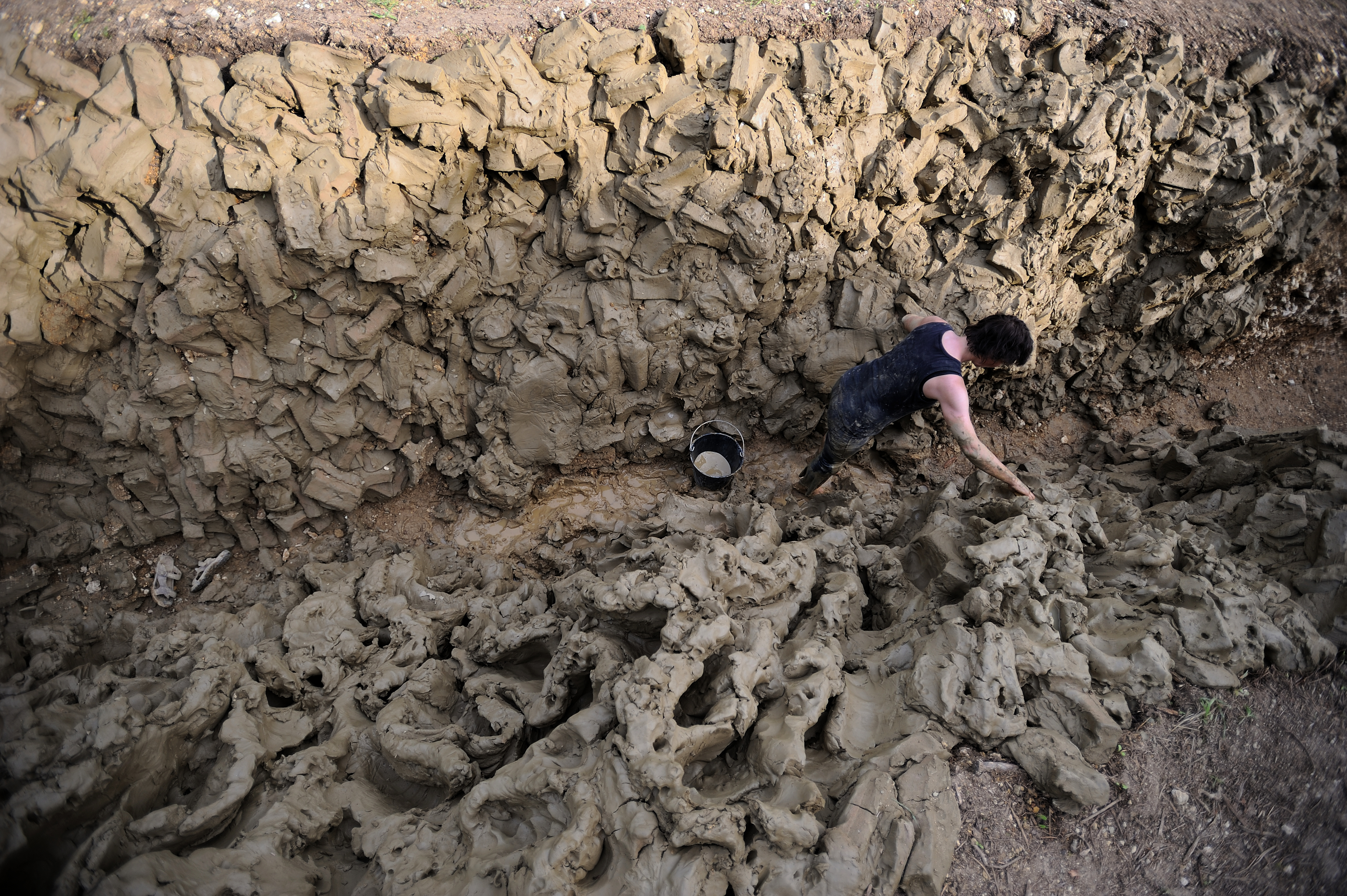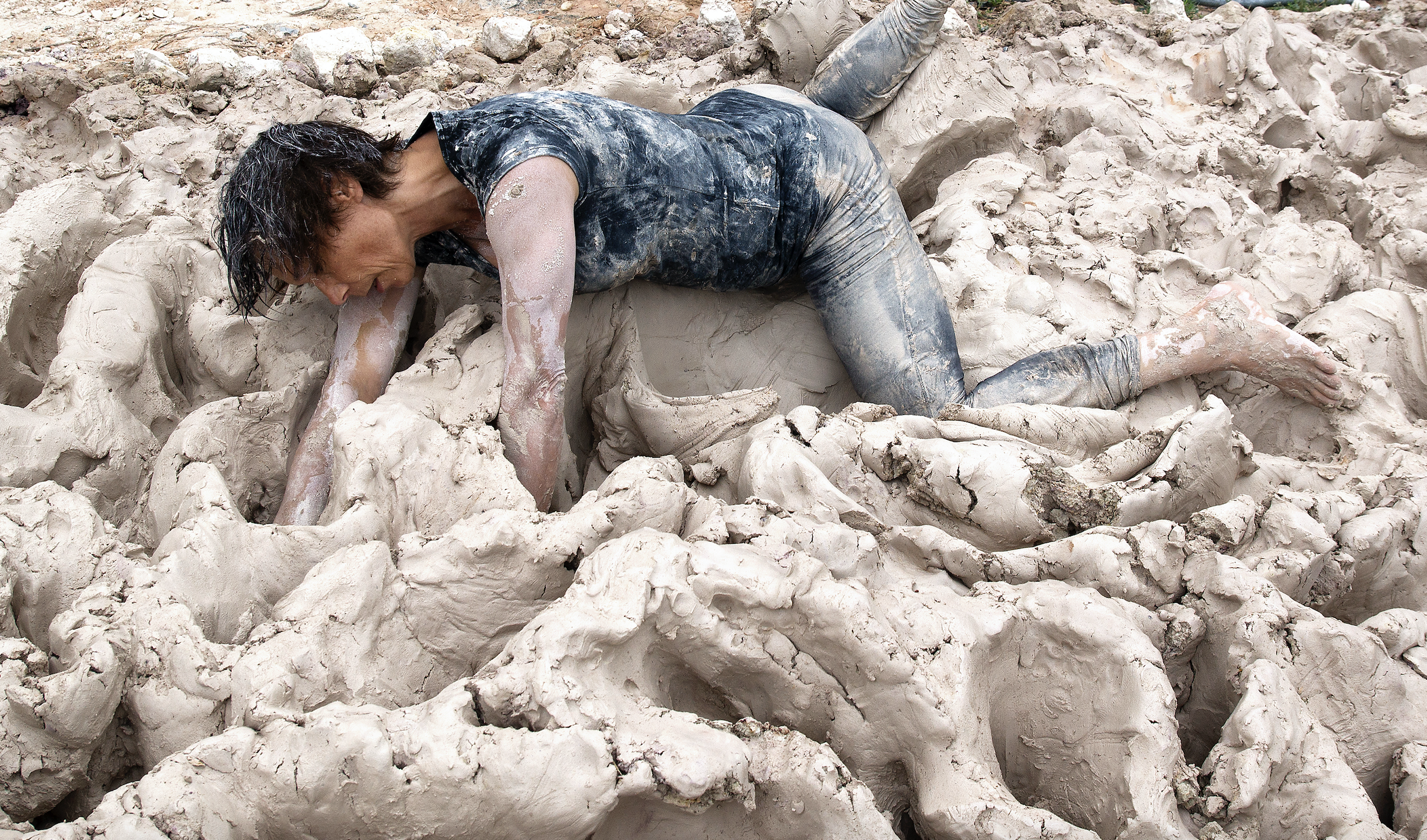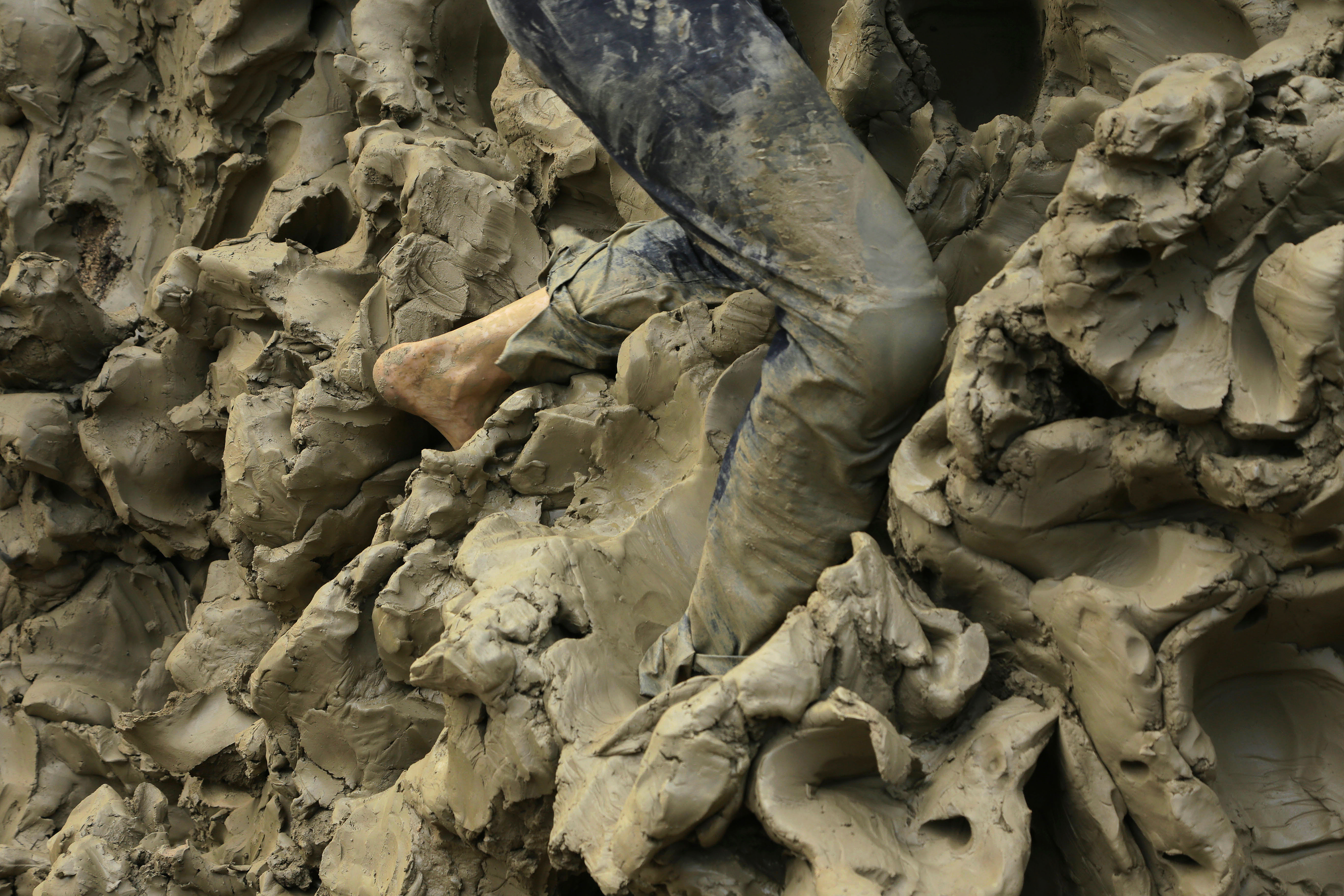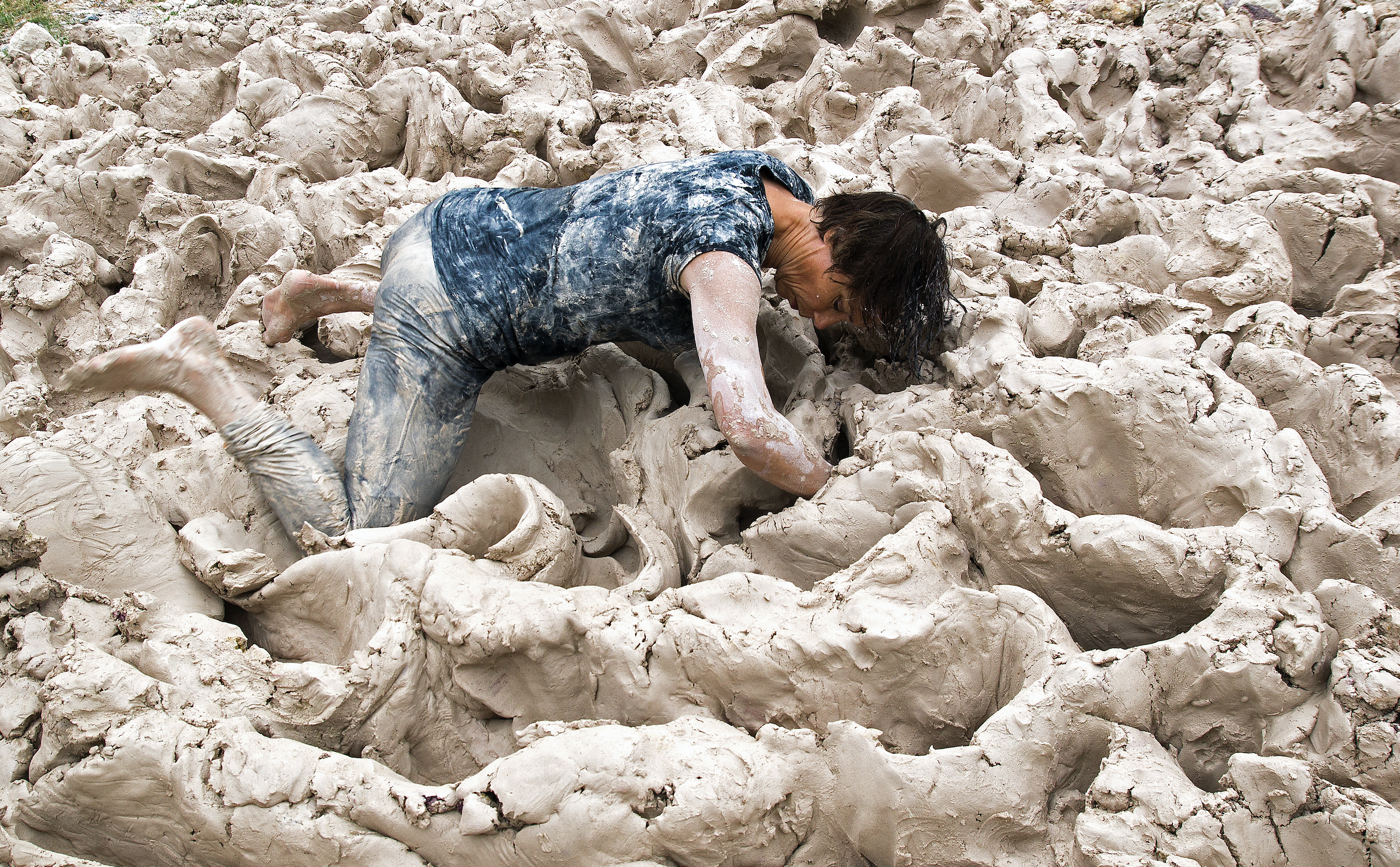 "Described as a ‘true mud person,’ Alexandra Engelfriet works with huge bodies of clay, using her body as a tool with which to form and sculpt. Her work leaves a profound, visceral, and unspoken sense of relation; body and clay giving and receiving, forcing and suffering, setting geological time-scales against the breath of the human body. As an anthropologist interested in the relations between landscape, materials, and the practices of art, I was enthralled by the sheer physicality of Alexandra’s practice, the seriousness of this play clay affords." – Marc Higgin