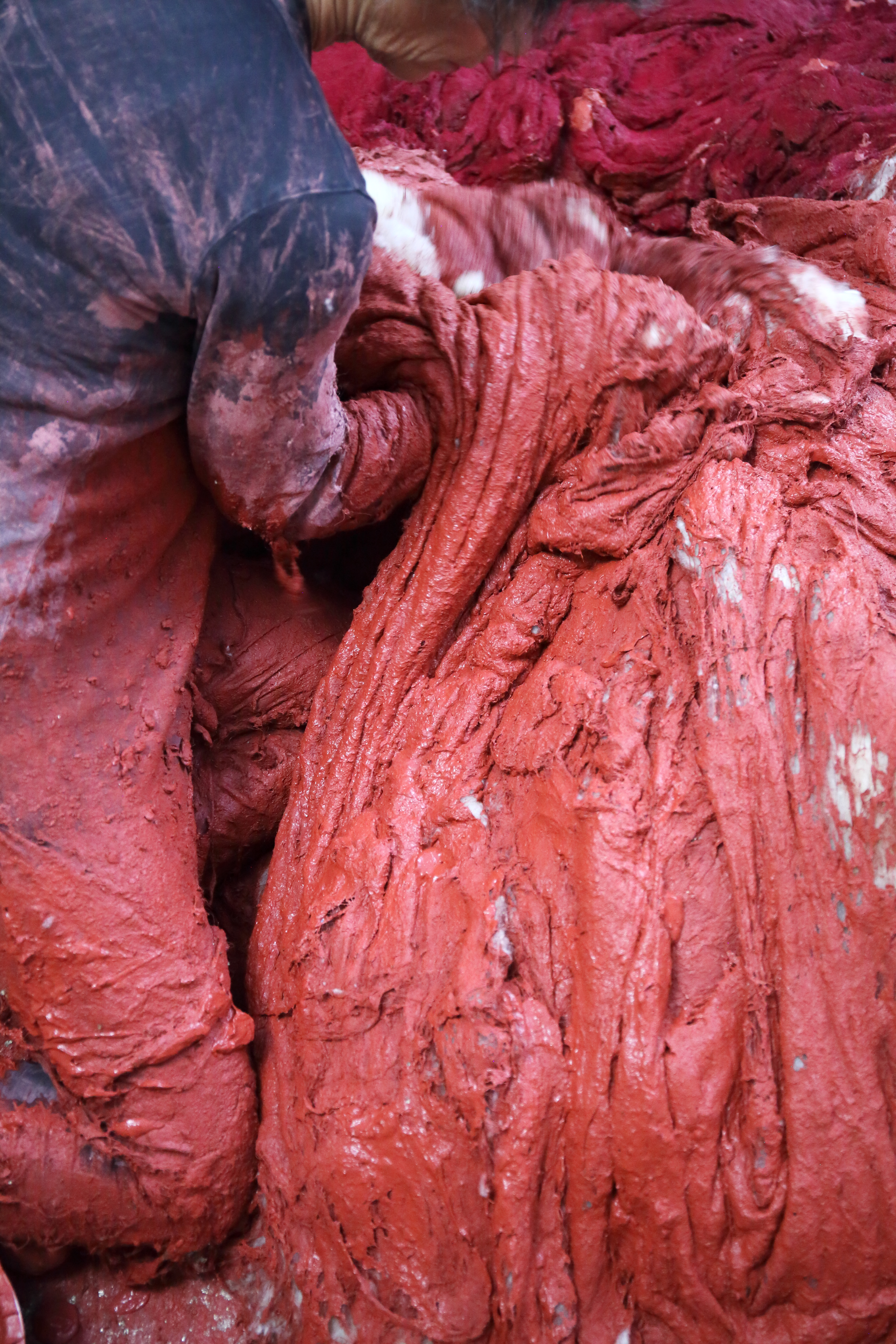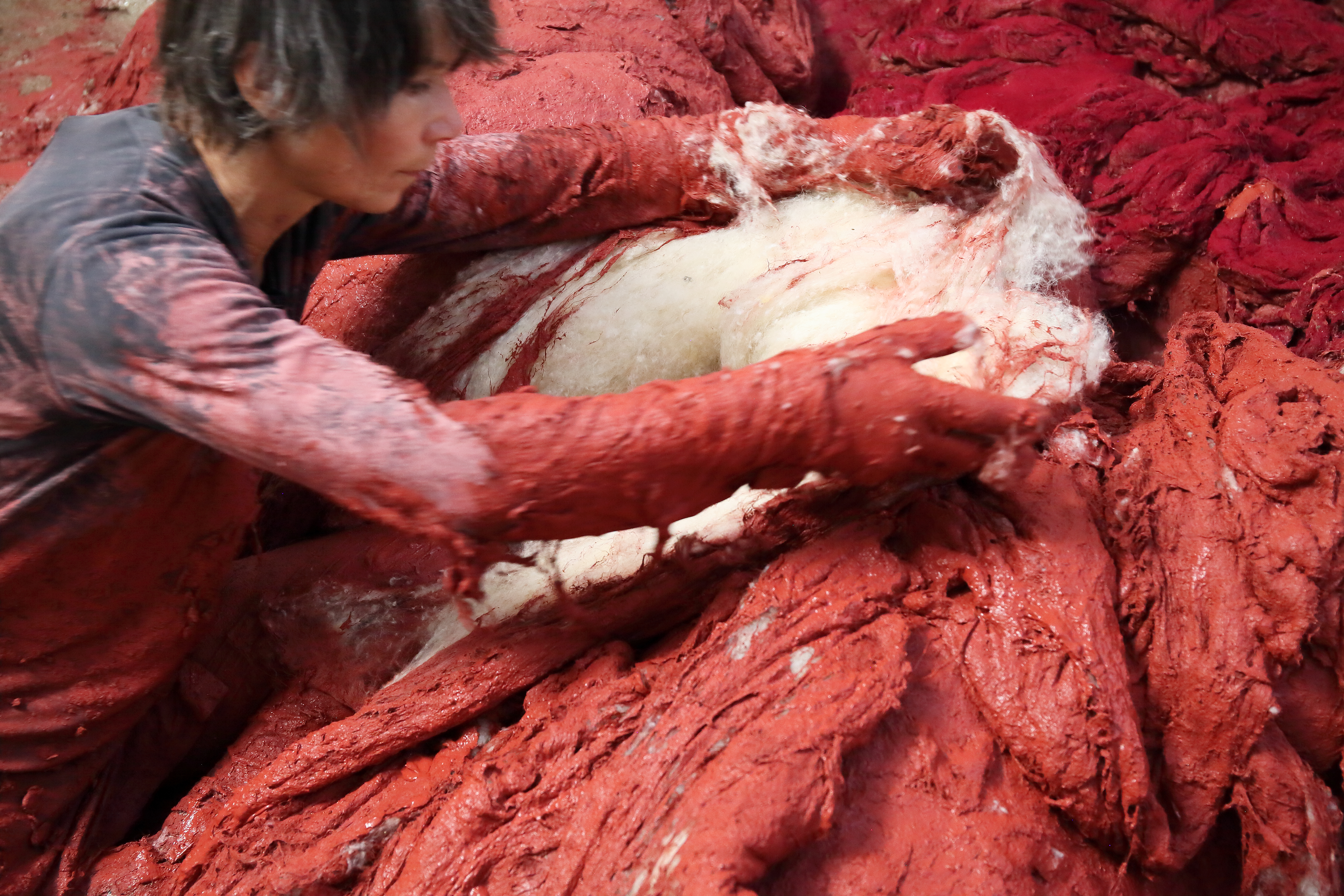 During the winter of 2022, the American/French photographer Alison Harris followed the making of a permanent sculpture made with wool and clay-slip mixed with red ochres. These materials were shaped on a previously sculpted mass of clay mixed with vermiculite. While the clay-slip was still wet, I dusted it with a bright fuchsia-colored pigment, which attached itself to the wet slip. When the skin of wool, clay-slip and pigment was hard, the clay was taken away from under it. I am now in the process of developing this process further and creating a lasting body of work.