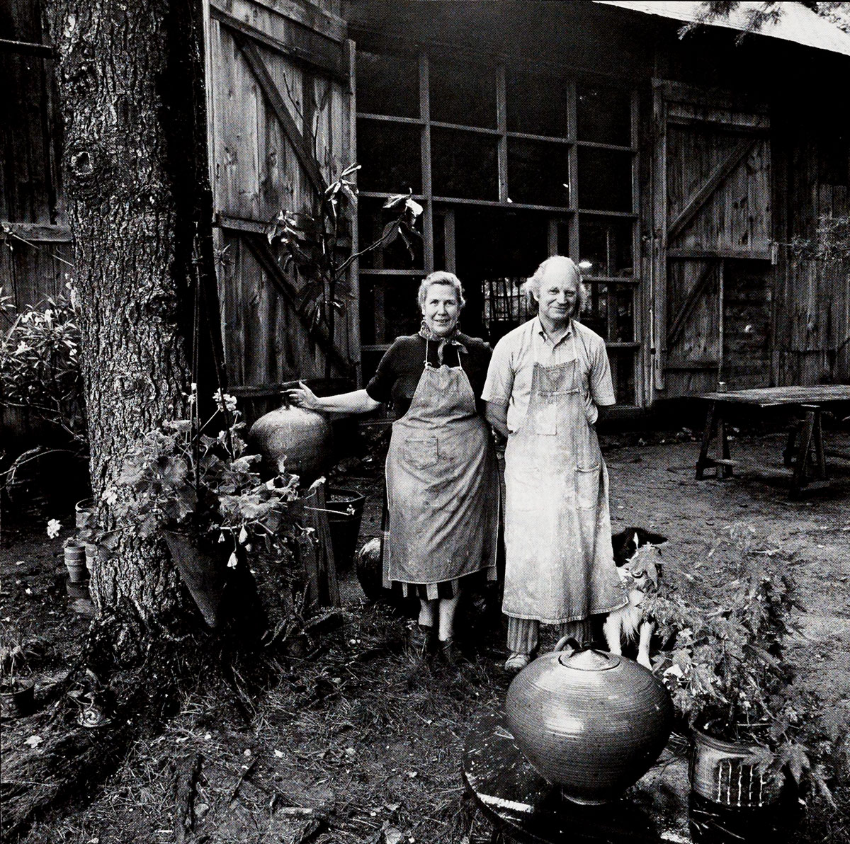 Husband and wife team. Studio potters since the nineteen forties. Production throwing and slab-making in stoneware, porcelain, and saltglaze. Studio in an old barn. 100 cu. ft. catenary gas kiln, plus salt kiln. Currently two apprentices, nine sheep, twelve lambs. Long active participants in the League of N. H. Craftsmen. Otto: if you can lift it, you can throw it.