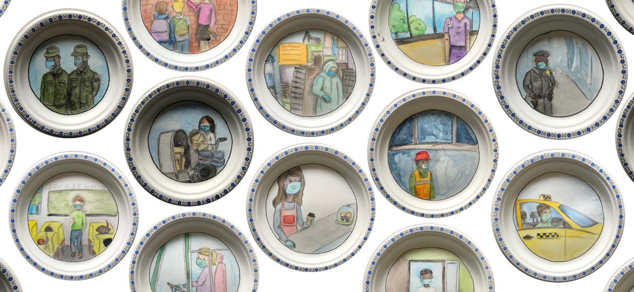 a seat at the table, by Canadian artist Carole Epp, was on display at the Art Gallery of Alberta as part of their exhibition borderLINE: 2020 Biennial of Contemporary Art on display from September 26, 2020, to January 3, 2021. The installation was comprised of a dinner table holding approximately one hundred paper Royal Chinet plates, each painted with different portraits of frontline workers performing the variety of services they have delivered throughout the pandemic. Bolted on top of these plates is a piece of plexiglass. This foundation supports four vintage china plates, each inscribed with a different phrase from anti-mask protests. Four upholstered chairs surround the table and complete the piece.
