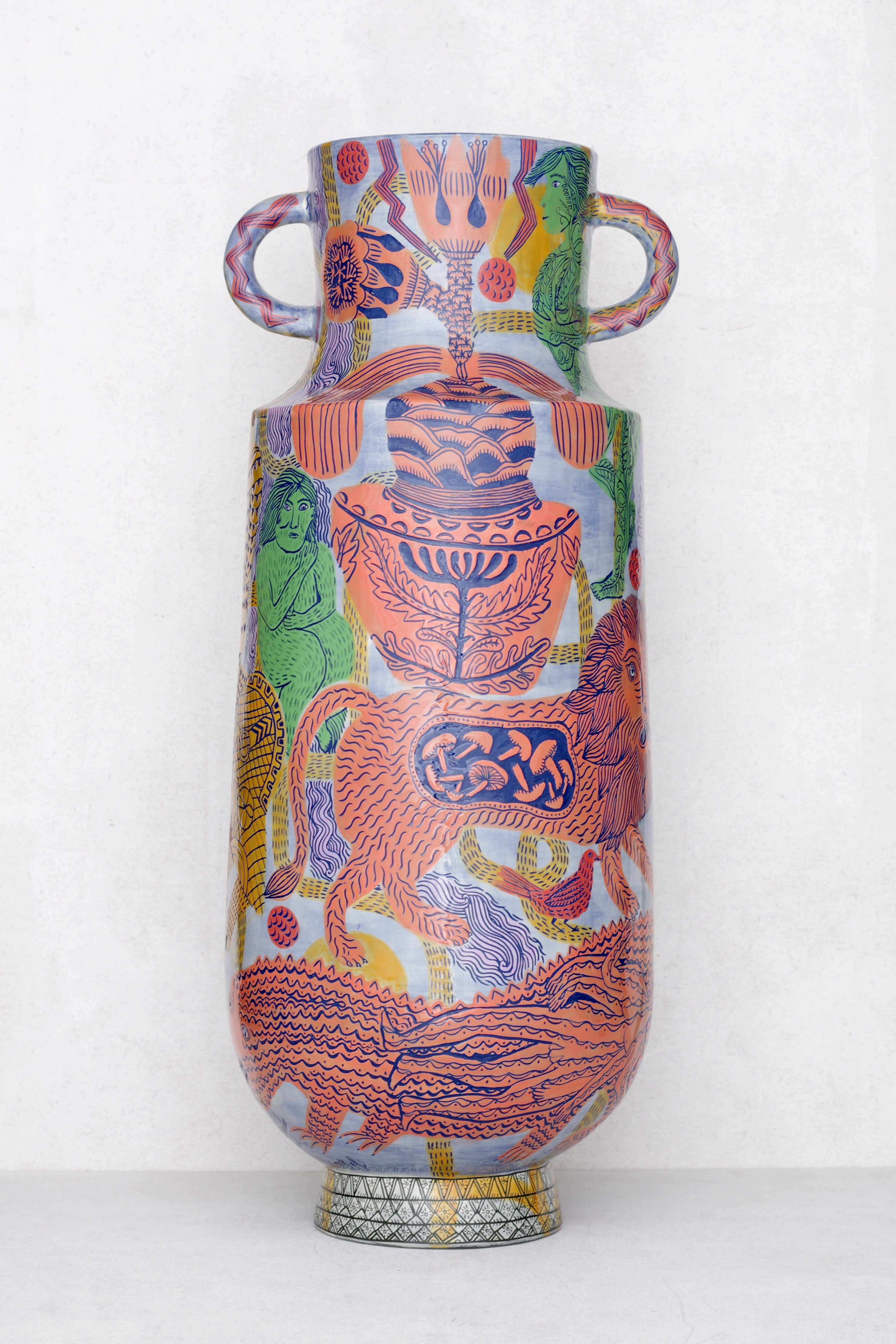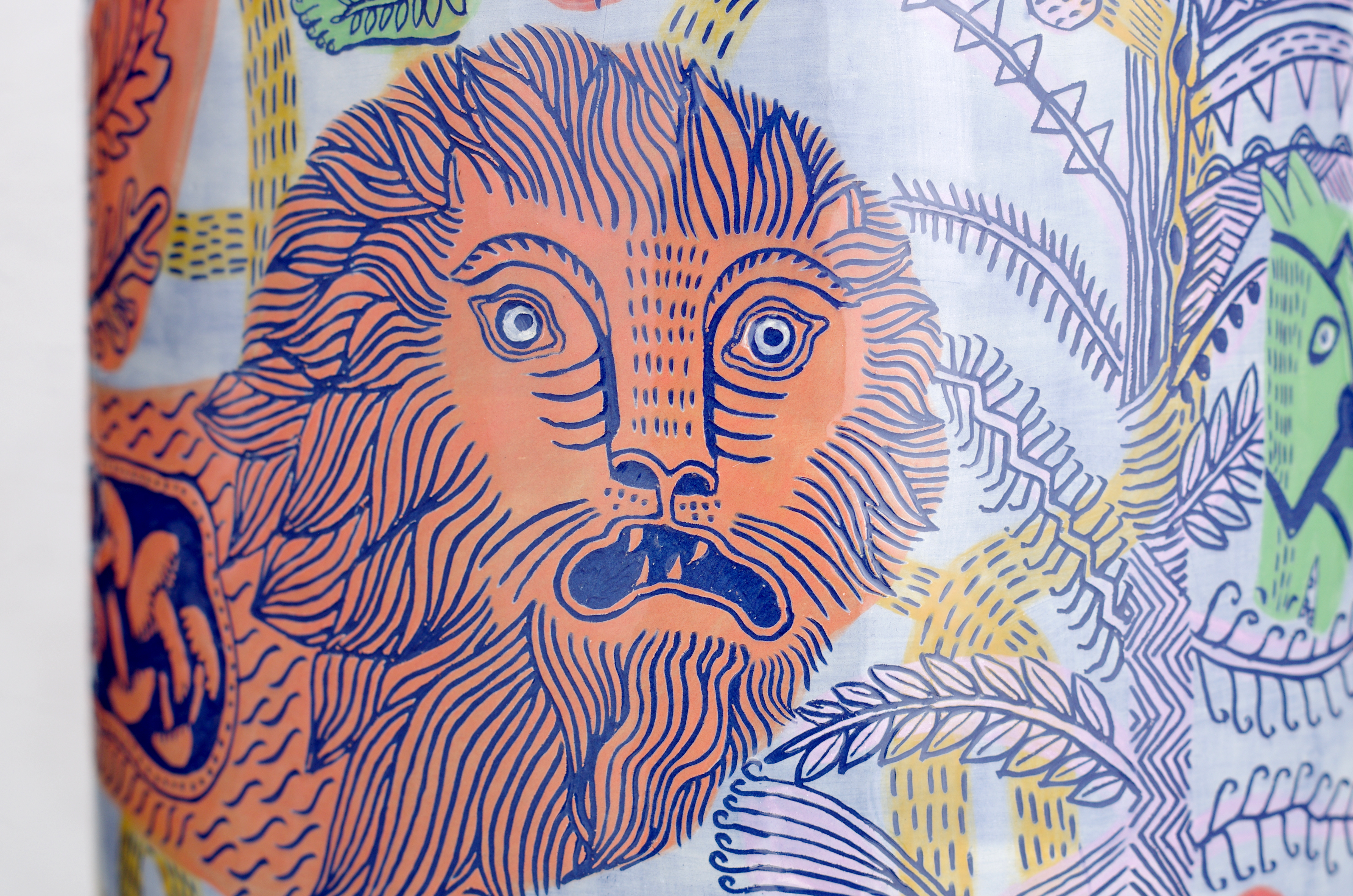 Nascent for some time, Conscious Dreaming as a concept began pre-COVID-19, in 2020, when Lindo and Brookes were invited by Aberystwyth University’s School of Art to make a new body of work using the institution’s collection of prints and ceramics as their starting point. Drawn to the work of the somewhat obscure printmaker Christine Penn and the early pioneer studio potter Frances Emma Richards, Lindo and Brookes referenced the former’s darkly-surreal iconography and the latter’s serenity of form through their ceramics.