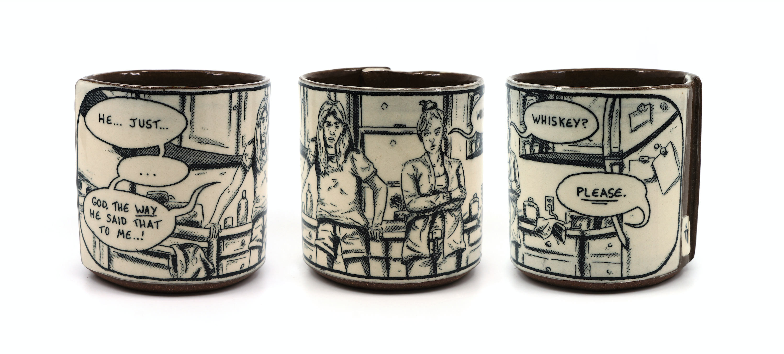 Originally from Minnesota's St. Croix Valley, Ian M. Petrie grew up surrounded by utilitarian pottery. During his studies at the University of Minnesota (BFA, 2013), he became enamored with decorating his handbuilt pottery with illustrations inspired by comics and manga. Throughout the course of two emerging artist residency programs at the Northern Clay Center and the Worcester Center for Crafts, Ian learned to incorporate the process of screen-printing to achieve more control and clarity in his graphic pottery. Today, Ian lives in Philadelphia and appreciates making highly decorated but affordable pottery that looks equally at home on the wall or on the table.