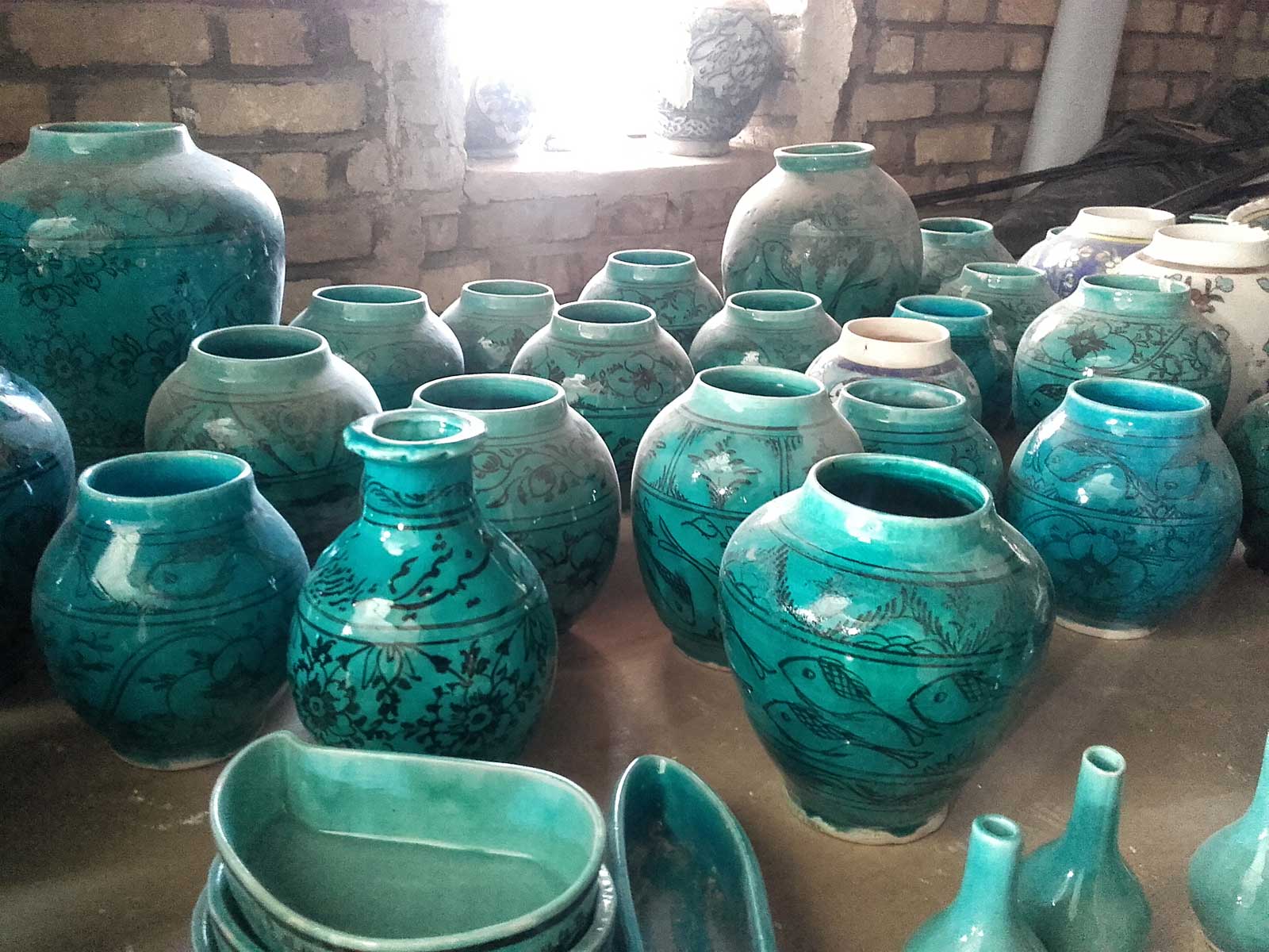 These turquoise pots represent a changing pottery tradition. The fish motif  is traditional to the area around the village of Shah Reza, but the forms  and color cater to current fashions.