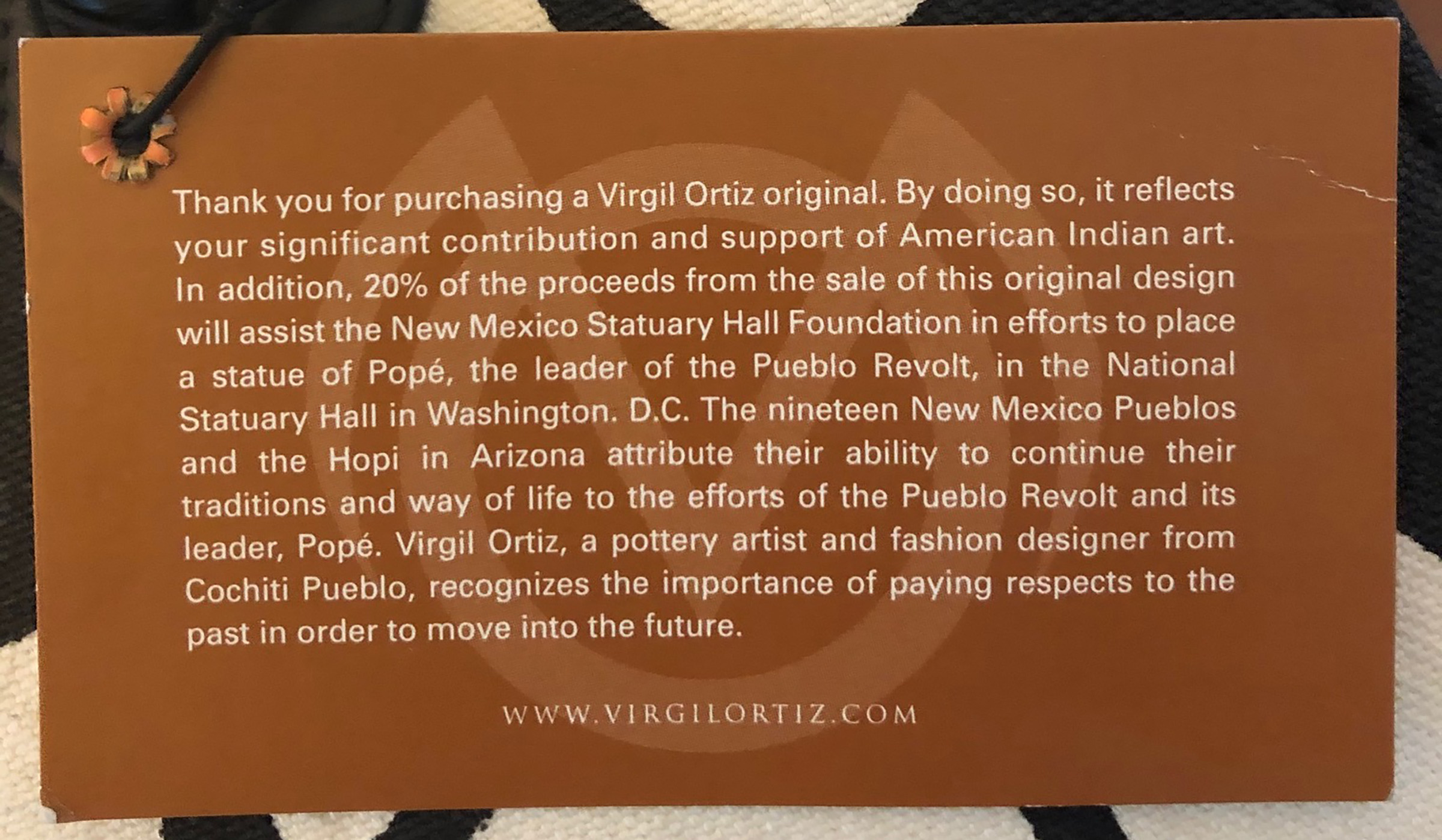TA: Yes, telling the story of the Pueblo Revolt of 1680 is paramount. When V and I first got together in business I immediately hired a trademark attorney. The first thing I did was trademark his logo. [Pueblo culture is reflected in all VO designs, motivating this proprietary position.] Close to that time, we had just launched the purse design. My sister Pamela was the president of the Po’pay Foundation and they were about to take Po’Pay to Washington, DC. She said to me, “Tish, I think it's important that as you and V are starting your business together, that you consider donating a portion of the handbag sales to the foundation.” I said, “That's an excellent idea.” She pointed out that Dad worked all these years to get Po’pay to the capital, so that's how we marketed the purses. Coming out of the gate, we said, twenty-percent of the proceeds are going to the Po’pay Foundation. When they sold out in minutes, it was the greatest joy for me to write that check to the foundation. My dad died three years ago. One of his dying wishes – he said to me, “Tisha, I want you and Virgil to make sure that you continue to let people know what happened.”