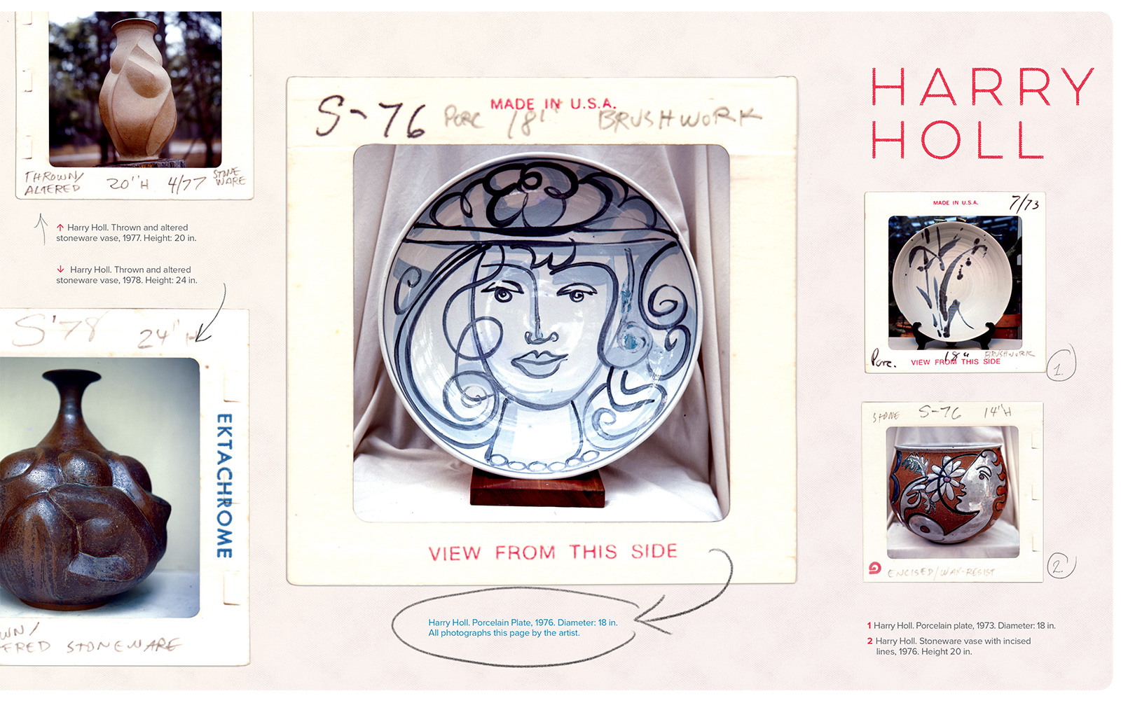 I asked Harry if I could work with him. He asked who I was and about my background. I told him I had taken only one undergraduate pottery class and was teaching a class but didn’t know how to throw; he kindly sent me on my way. I changed my trajectory when I returned to school, taking every pottery class available so that I could come back to apprentice with Harry.Top Slide: Harry Holl. Porcelain Plate, 1976. Diameter: 18 in.