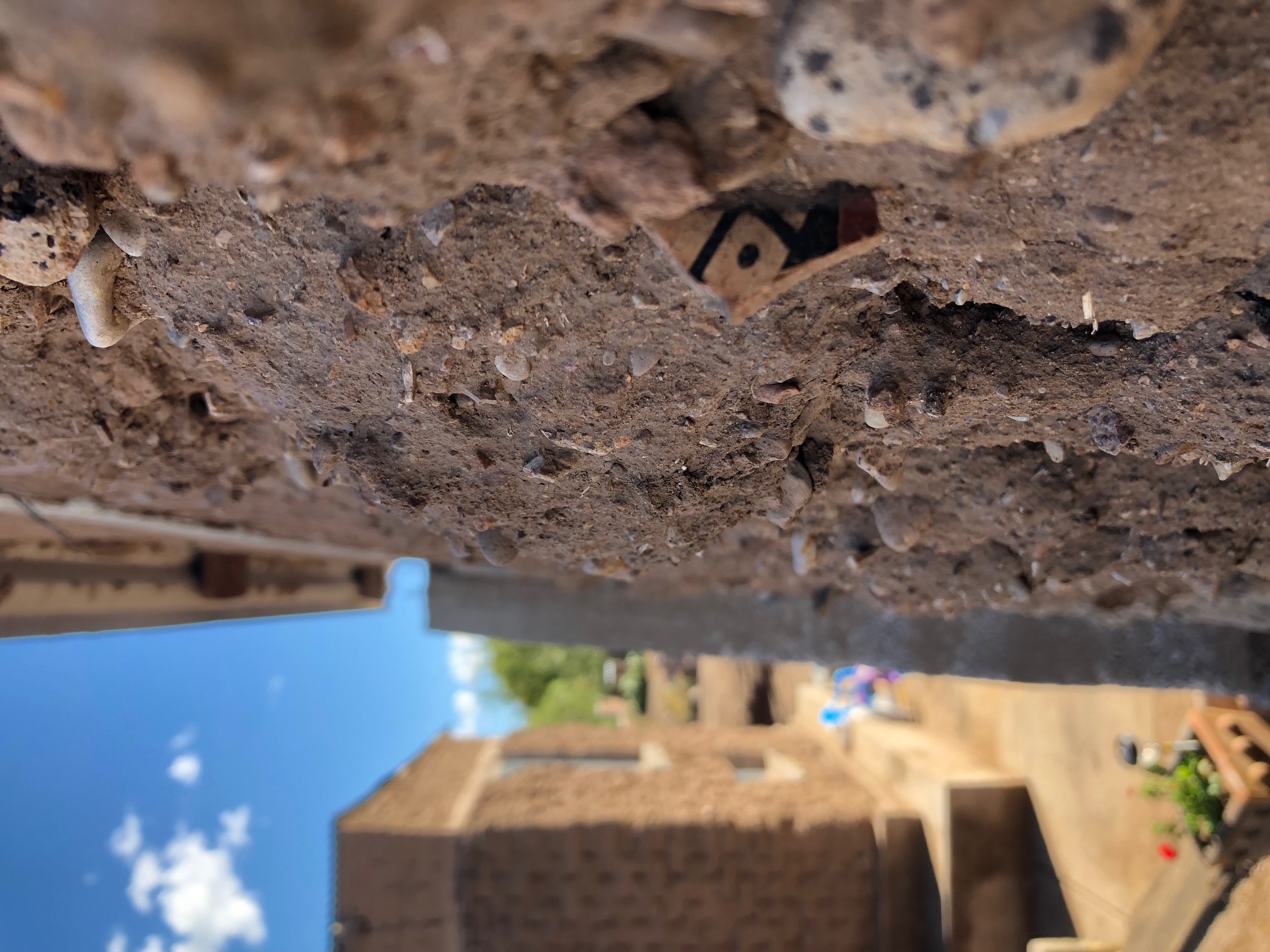 In many cases contemporary towns have been built using the remnants of the old buildings, mixing together soil, pottery sherds, and stone artifacts to make the new adobe structures, the favorite construction material in the region. The result is adobe buildings from the nineteenth and twentieth century in the Casas Grandes region show the weathered adobe bricks, pottery sherds, and arrowheads made on the site hundreds of years ago. Big metates (flat stones for grinding grains, cocoa beans, or plants) may be used in foundations and as cornerstones. In some cases the adobe even shows remnants of burials, such as human teeth and pieces of human bone. Less common, standing walls of rammed earth, a technique used to build Paquimé houses, were used as they were found and the modern rooms were completed with adobe. And so, since the foundation of Estación Pearson, now Juan Mata Ortiz or just Mata Ortiz as it is generally called these days, the people have known of the existence of a much older culture, now disappeared, whose vestiges could be found all around.