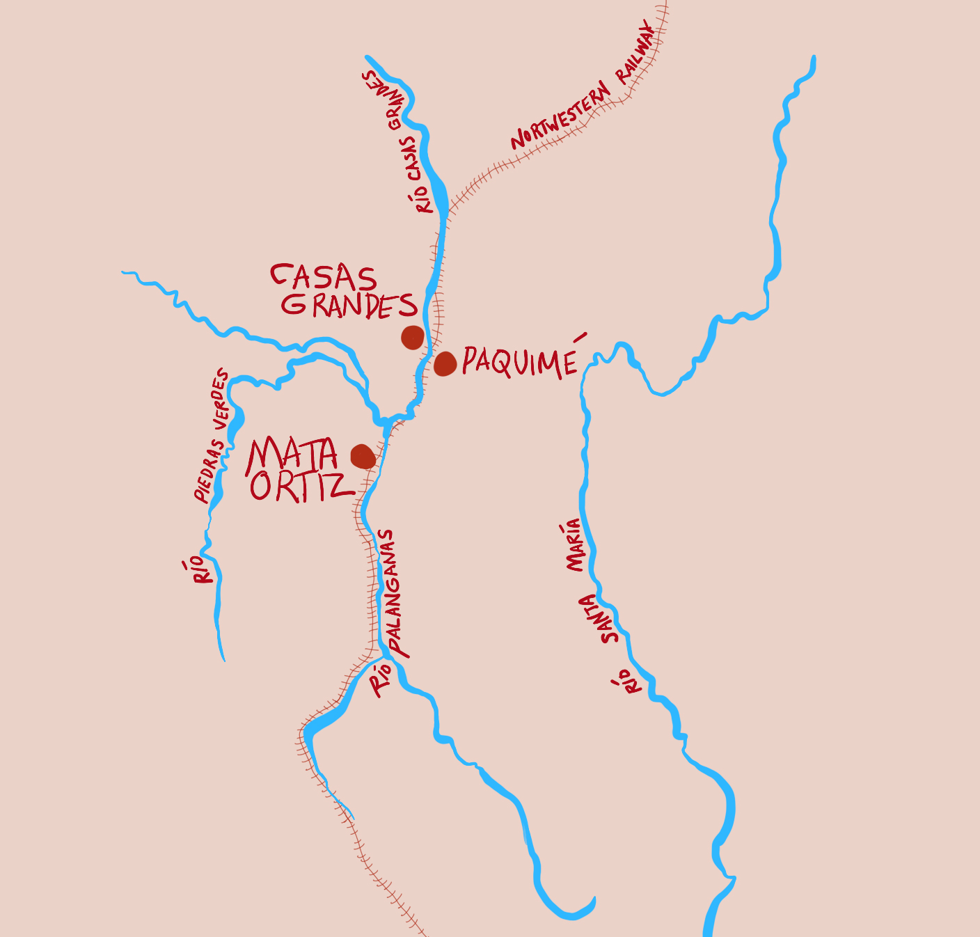 The Casas Grandes River is formed by two main tributaries coming down into the Casas Grandes Valley – the Piedras Verdes from the western mountains and the Palanganas River descending from the southern mountains – both belong to the Sierra Madre Occidental. Mata Ortiz is situated along the Palanganas River, some twenty-five kilometers south of Casas Grandes and Paquimé which, in turn, are situated along the Casas Grandes River. (See map for reference) And just as the old settlements were established along rivers and geographically strategic points around the valleys and mesas, so are modern towns – not only in Chihuahua, but all over México and the Americas.