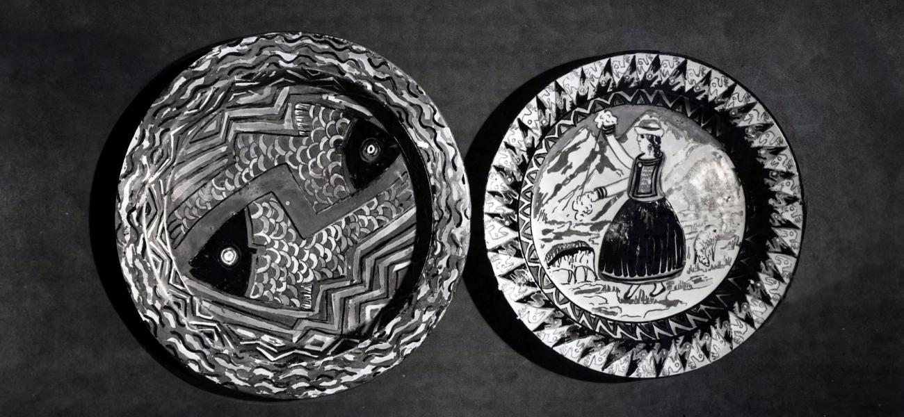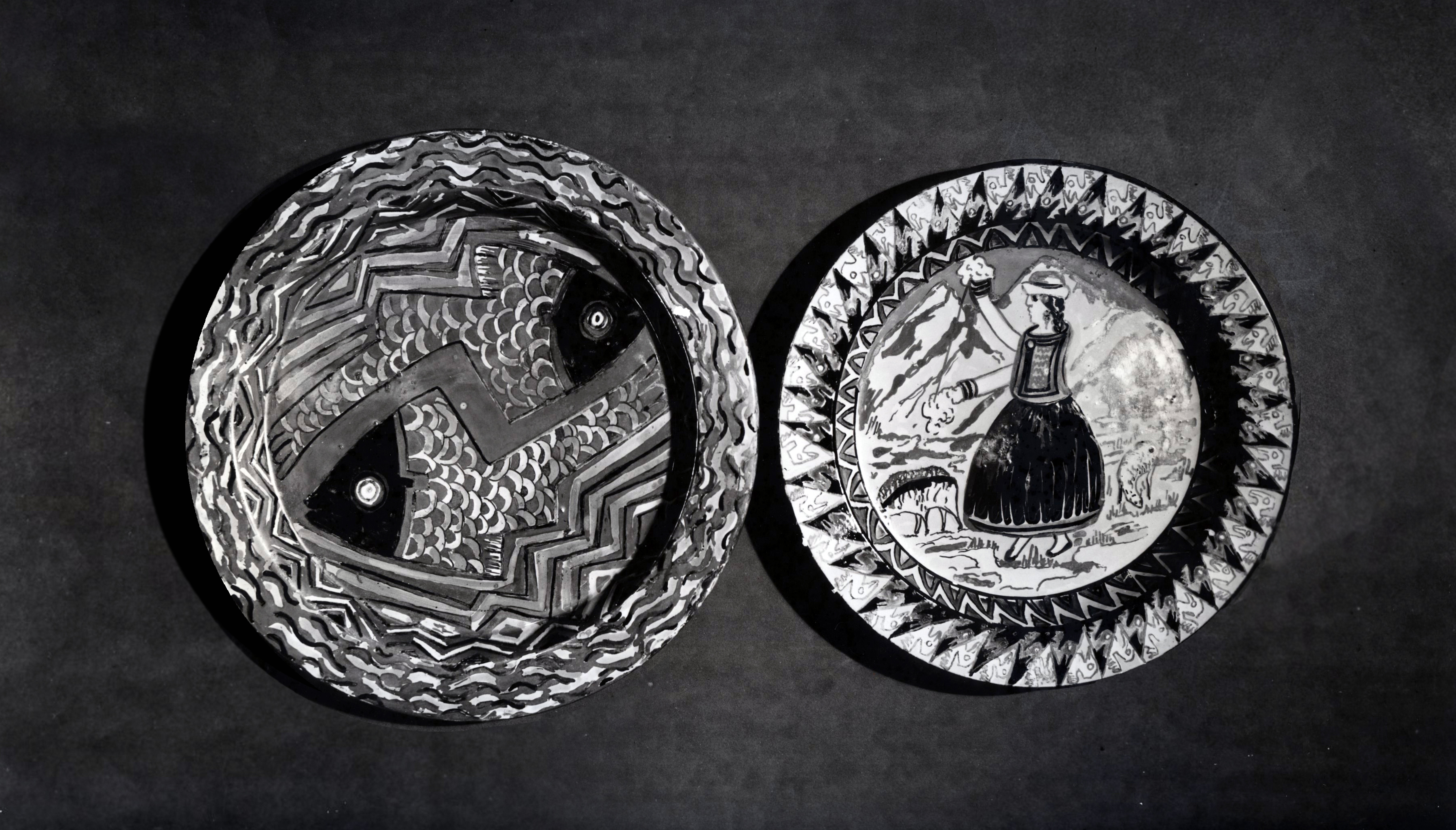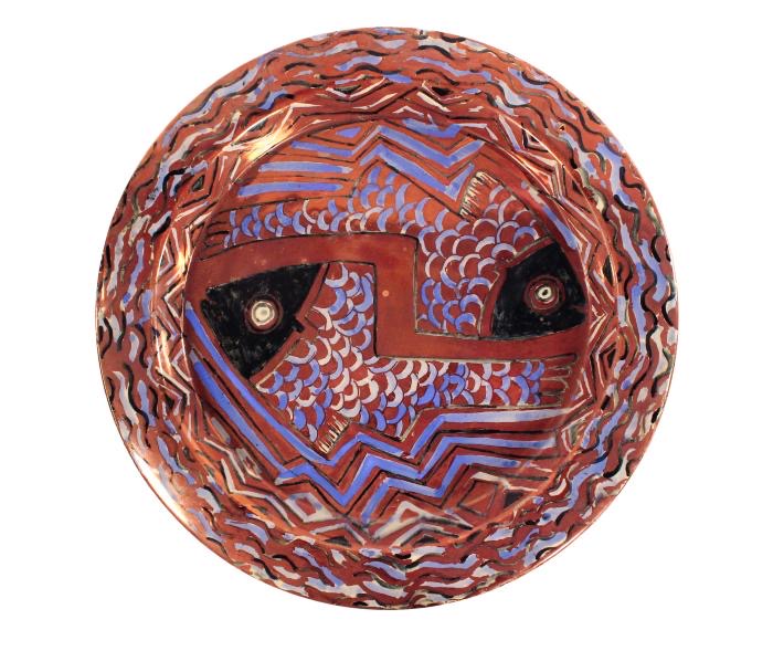 Though made by a Latin American ceramist, Saco’s plate was potted and fired in Europe; Manises, Spain, to be exact. On its reverse, the earthenware-looking dish reveals more information: it is made of white clay, and a hand-written note describes its decoration as being in an “ancient Peruvian cultural style.” Instead of leaving the light clay body visible, Saco decided to cover the work with a reddish-brown glaze, and she accentuated the animal forms with thick contour lines in black. Stylistically, these decisions refer to the earthenware ceramics of the ancient Nazca civilization, while also marking Saco’s participation in a contemporary art movement.