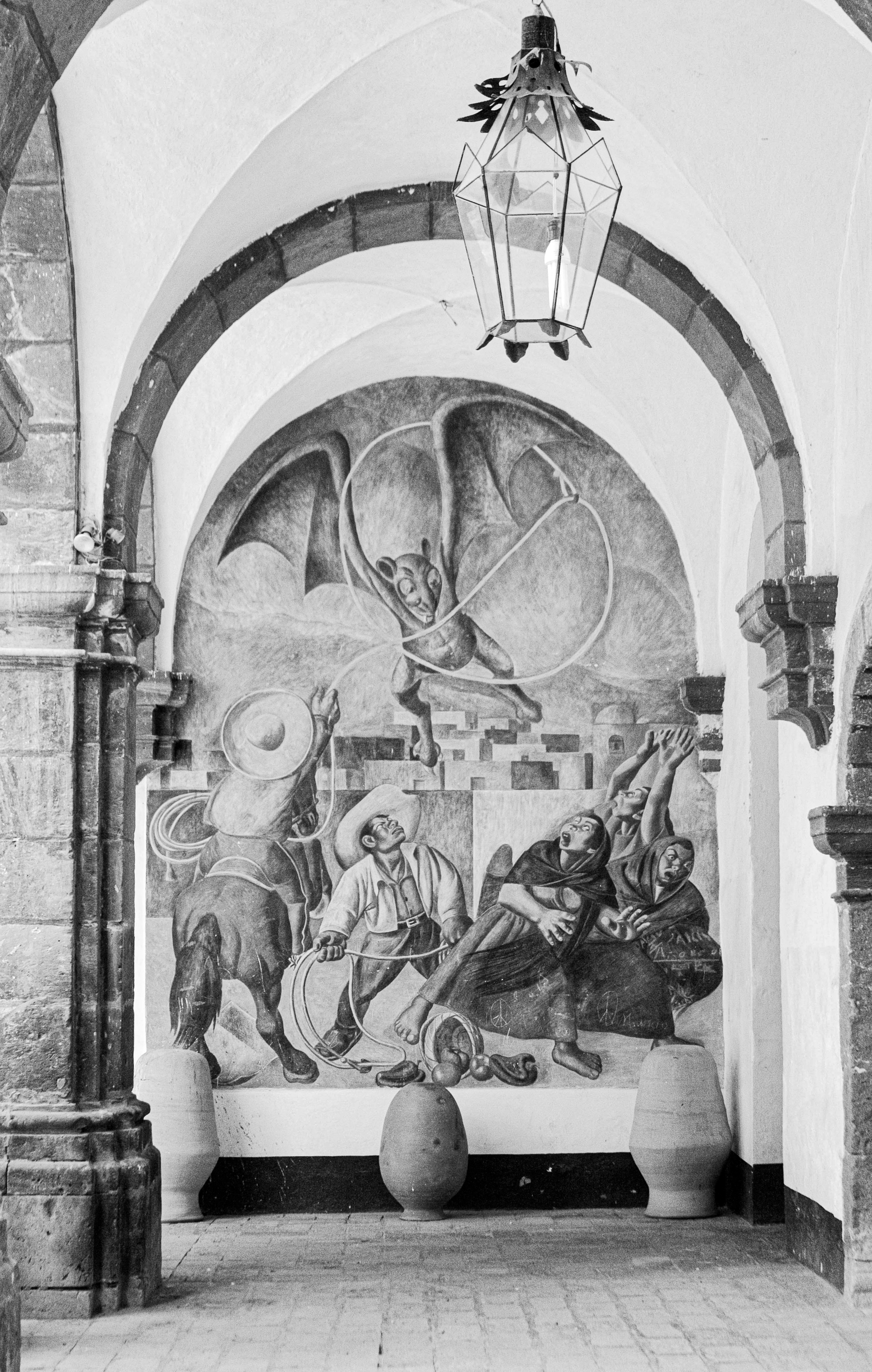 Like Saco, Don Schreckengost was inspired by recent travels. In 1939, he was a professor in the Ceramic Art Department of Alfred University and accepted a summer position in Guanajuato, Mexico, at the Escuela de Bellas Artes in San Miguel de Allende (now the Centro Cultural Ignacio Ramírez “El Nigromante”). During this time, he worked on at least one mural for the school, perhaps in collaboration with the Mexican painter Pedro Martínez. Documentation reliably attributes murals to Martínez, but inconsistently describes Schreckengost’s involvement.
