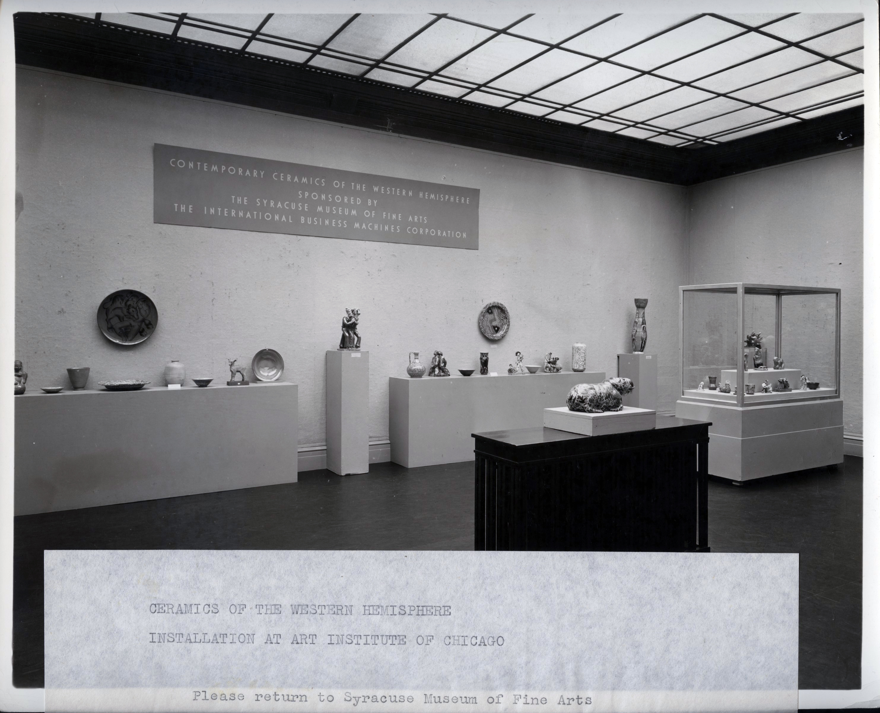 In the fall of 1941, the influential director of the Syracuse Museum of Art, Anna Wetherill Olmsted, organized a joint exhibition – the Tenth Ceramic National and the Contemporary Ceramics of the Western Hemisphere exhibitions with the corporate sponsorship of the International Business Machines Corporation (IBM). The collaboration between Olmsted and IBM founder and president, Thomas J. Watson, Sr., may seem surprising, but in 1941, their concerns were sympathetic. Both leaders were important supporters of President Franklin D. Roosevelt and his federal art programs. Olmsted worked on various New Deal projects during her directorship, and in 1937, she was a Roosevelt-appointed delegate to the International Exposition in Paris.[4] Also appointed by FDR was Watson, the Commissioner General of the American Section of the fair. Inspired by this project, the IBM founder established the corporation’s Department of Fine Arts in 1938 to promote a “better understanding” between the “artist and businessman,” the “artist and his community,” and “people of different lands (between the Americas especially).”[5] Noticing the call for hemispheric solidarity, Watson and Olmsted looked to Latin America to support the government and, less idealistically, to enhance the reputations of their institutions.[6]