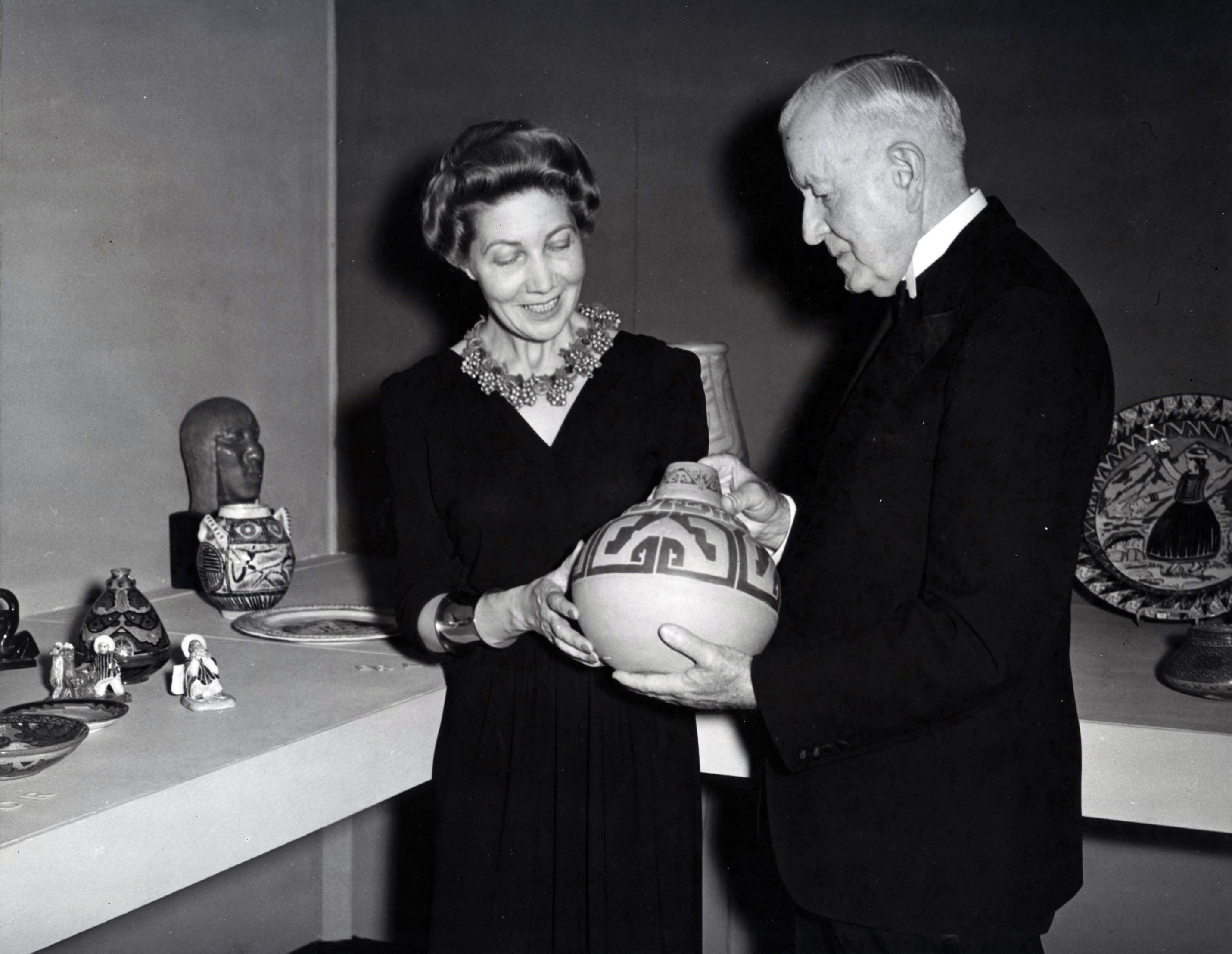 To build a collection of this caliber, Smith regularly traveled throughout the Americas to build relationships with local authorities, museum directors, and art leaders who chose works to be exhibited (and often acquired) by the corporation. For Contemporary Ceramics of the Western Hemisphere, she and her sister and secretary, Helen, took a steamship to Brazil and traveled for three months with an aim to purchase three to ten works from each Latin American country.[16] Though they were unable to reach their goal, the exhibition opened with ninety-three pieces of ceramics from fifteen countries in the region.[17]