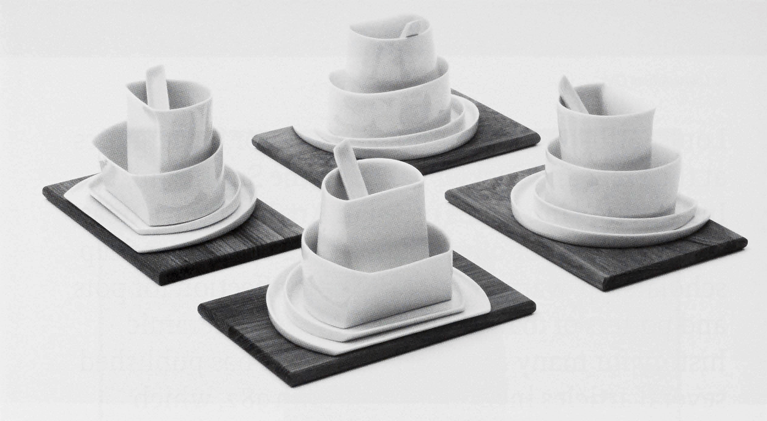 Take, for instance, Foursquare. I was inspired to create this piece by the childhood game of the same name. Despite the work's intended audience of adults, I wanted to give the overall impression of children and play. Even the spoons could remind someone of a Kit Kat candy or Fun Dip stick. As in such a game, imagine how different this work would seem if the settings, children, or players were set farther apart. Closer together? Not in a square, but perhaps in a rectangle such that only two players were close enough to interact? In other examples of my work, I place volumes in relation to one another in order to suggest interesting dining situations and social inter actions. As different as the experience of a great ballet would be between viewing it from the balcony and walking amongst its dancers, I am drawn to highlighting the contrast between the grand ness and anonymity of a long formal dining table and the intimacy of a shared plate.