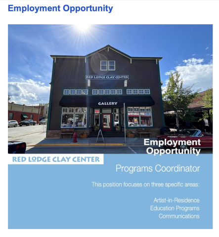 Come work with the Red Lodge Clay Center! We have a position opening for Programs Coordinator.