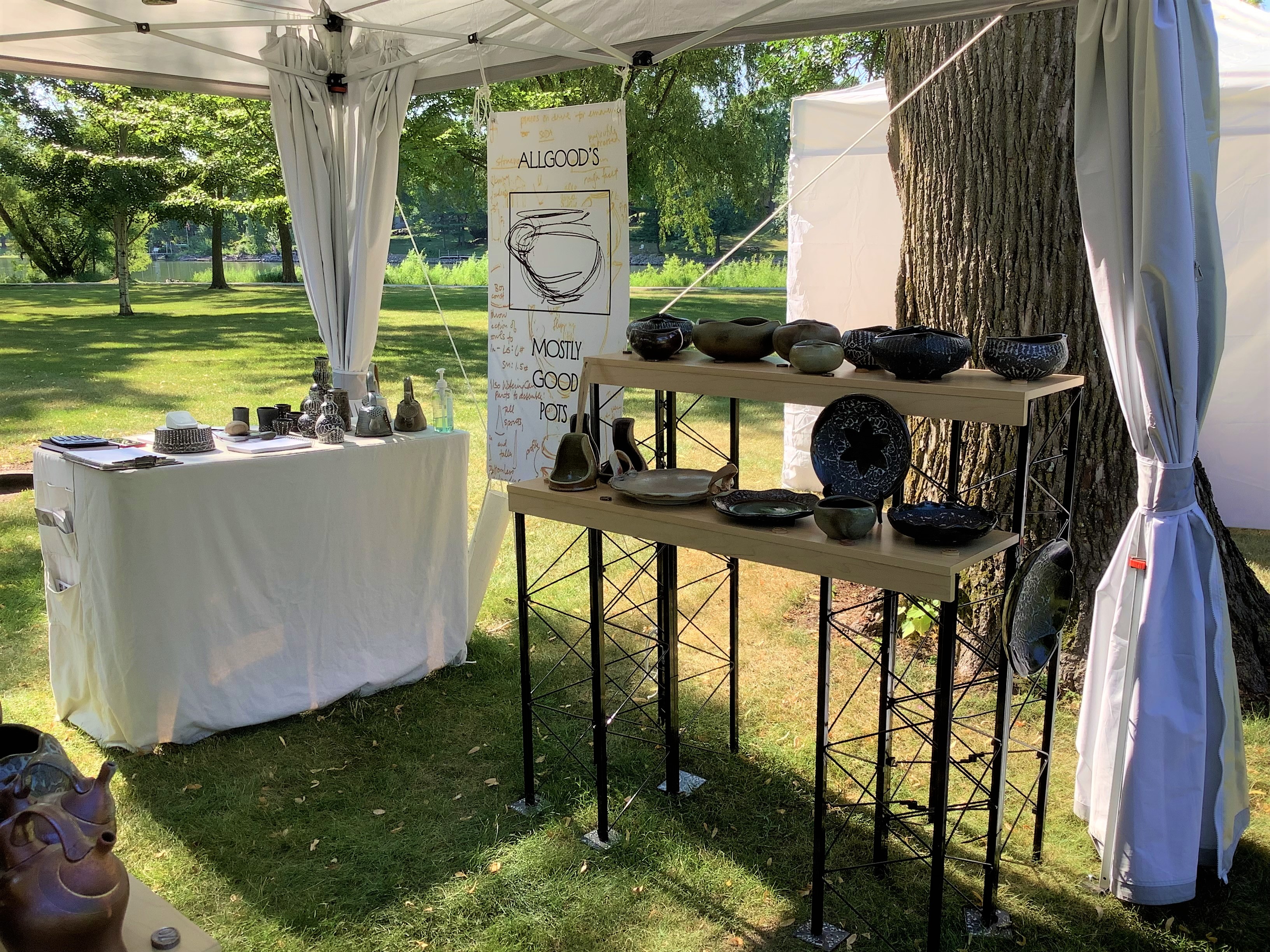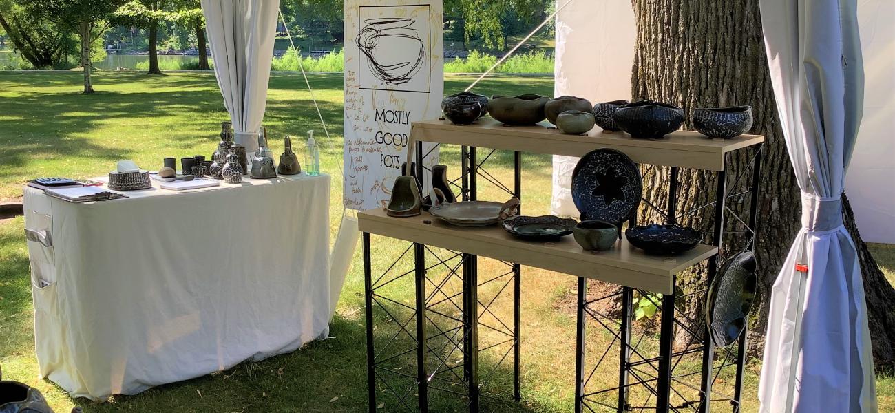 A wholesome circus of tents on the green comes into view. Doors, hatches, and tailgates are flung wide, spilling piles of bins and shelving. Jubilant organizer Betsy Price leads me to my spot, a vague outline of spray-painted corners. Hammers, laughter, the unmistakable clack of ceramic hitting boards fills the air. Ernest Miller appears, interrupting my study of the tent’s instructional pamphlet. We raise the tent. I reflect on the curiously analogous aid of shelter he offered when I first arrived in Minneapolis, the future more uncertain than I imagined. I unload and am overwhelmed. I love seeing my pots amid this ephemeral village.