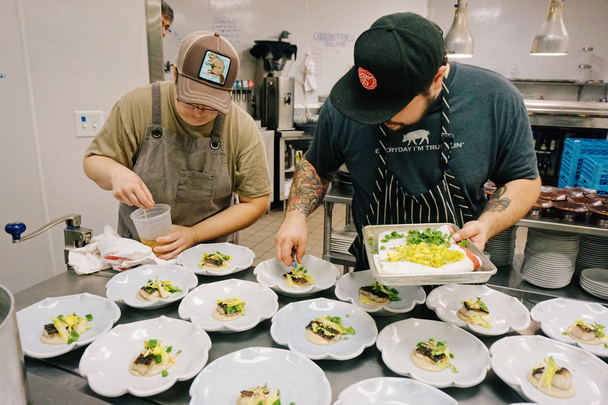Chef Alan Sternberg and assistants prepare dishes on the line. Ceramics by Tim Compton; wheel-thrown, Cone 6 porcelain, 8x8x3 in. each. Photograph by Audra Sternberg, 2017.