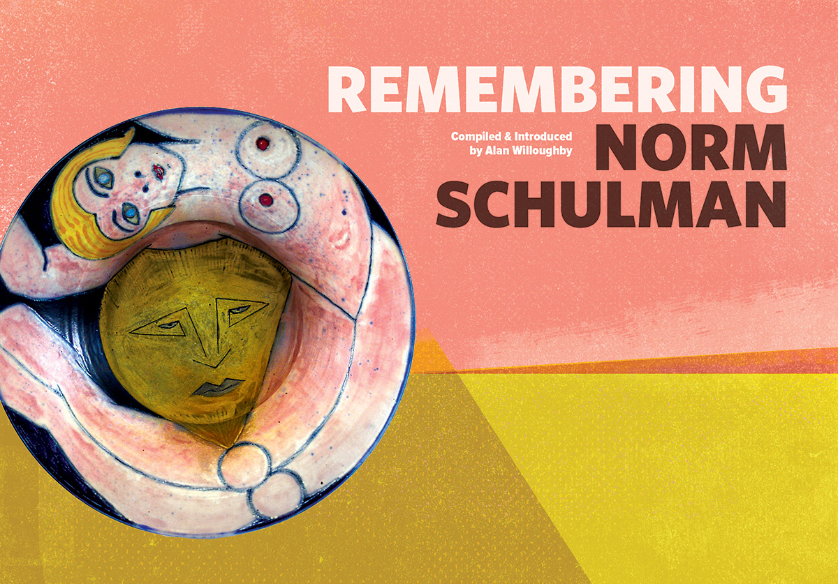 Norm Schulman passed away in October of 2014 in Penland, North Carolina. Norm was an independent thinker, at once rebellious and innovative, engaging, defiant, loving, passionate, a husband, a father, and perhaps most of all, a dreamer. He has joined other giants in clay who have died, including Peter Voulkos, Val Cushing, Viola Frey, Don Reitz, Robert Turner, and Gerry Williams. These first-generation clay makers (from the postwar, GI Bill, studio artists/craftsmen movement) in large part created and built the world of clay as we know it today.