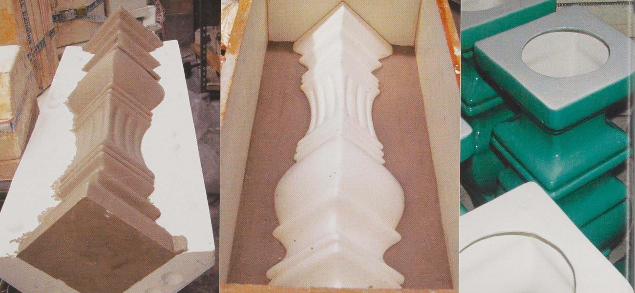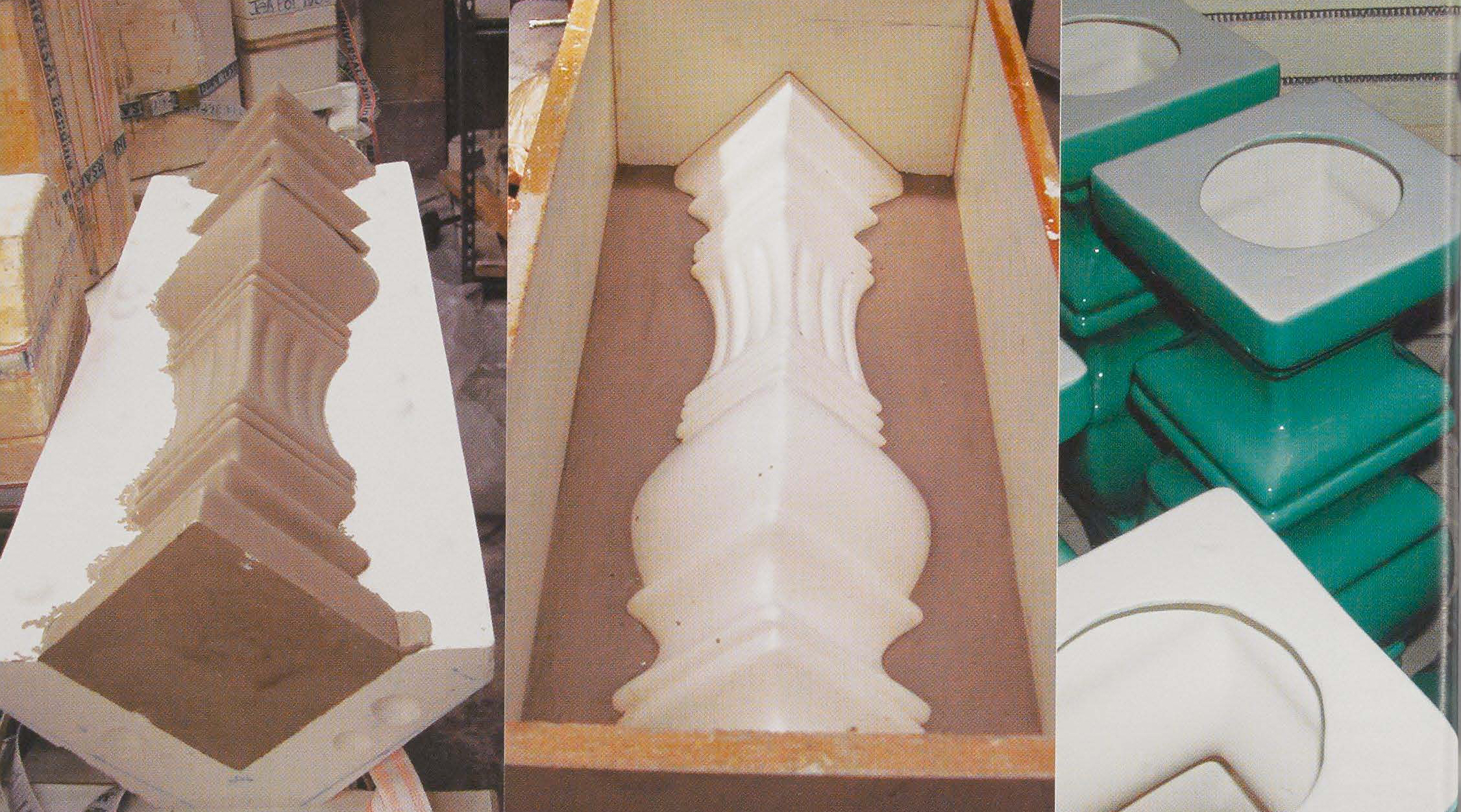 clay, wood, RENSHAPE, plastic, and, of course, plaster. I learned by doing all the ways to make molds and models such as running/sledding plaster, cutting metal templates, turning plaster on a whirler (vertical tooling), or on a lathe (horizontal turning).These