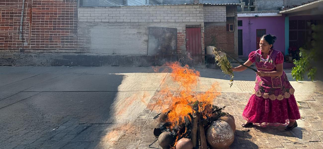 Macrina begins by constructing a circle of broken pots from past firings to create a protective shell. She then layers oak firewood, maguey leaves, and corn husks, whose earthy scents fill the air as the fire begins to grow. Larger pots cradle smaller ones, carefully stacked and fitted to optimize the firing process. Tepalcates (metal sheets) are added to prevent staining, and fuels such as pine, maguey stalks, corn husks, and bull dung sustain the flames.