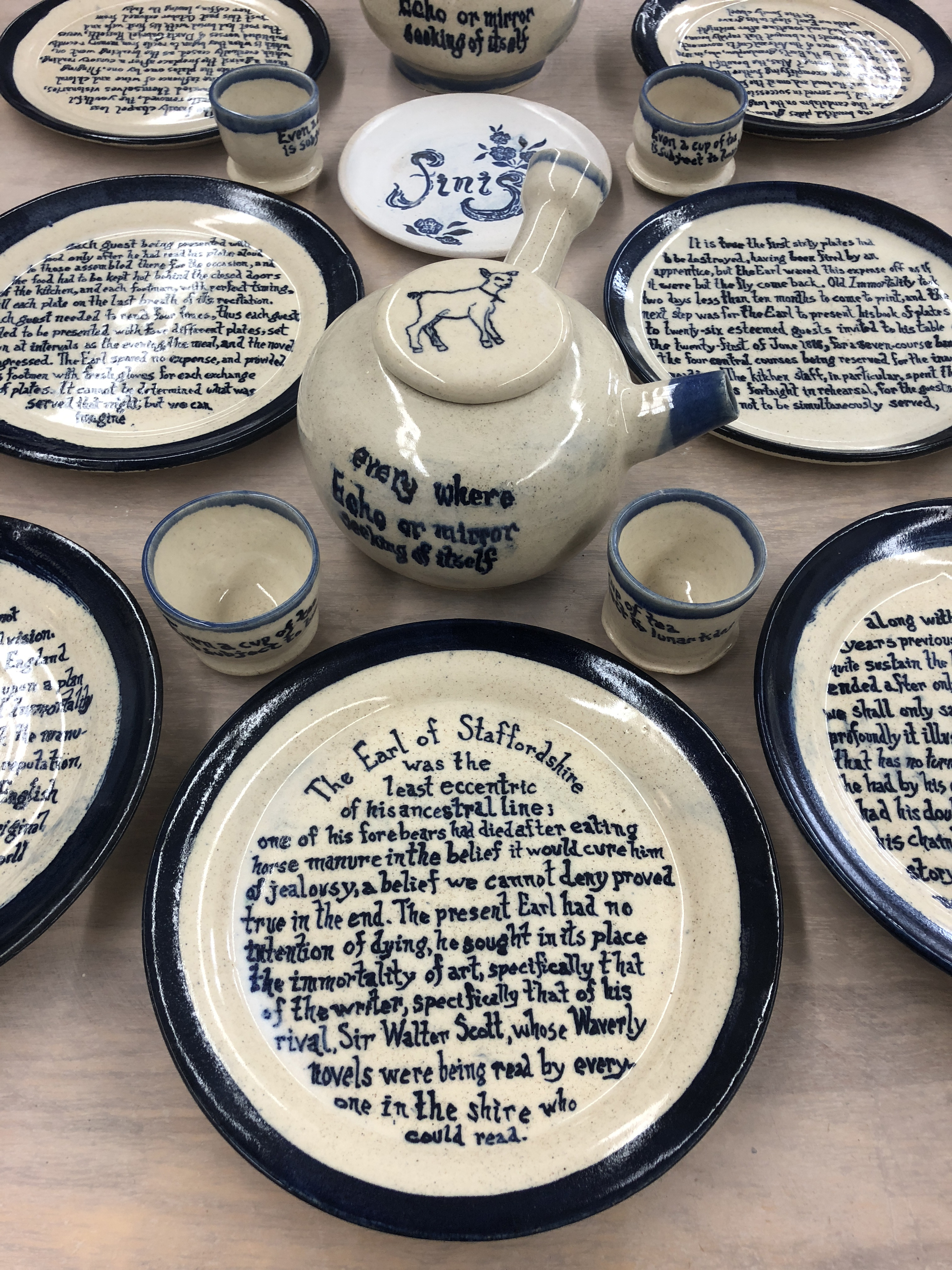 This past fall, I needed to learn how to make plates. Specifically, plates similar in form and decoration to those from Staffordshire, England, in the early 1800s. The reason for that was a story, “Old Immortality,” by the poet Mary Ruefle in her collection of short prose pieces, Private Property. The gist of the story concerns an imaginary nineteenth-century Earl of Staffordshire who writes a relatively boring novel and, rather than self-publishing it the typical way, instead, has it hand-written on a set of plates he then used for dinner parties. Ruefle was coming to UMass in December for a reading. I thought it would be fun to host a dinner for her on plates featuring “Old Immortality,” which we’d read aloud just like that fictional Earl had his dinner guests do with his novel before the eating began.