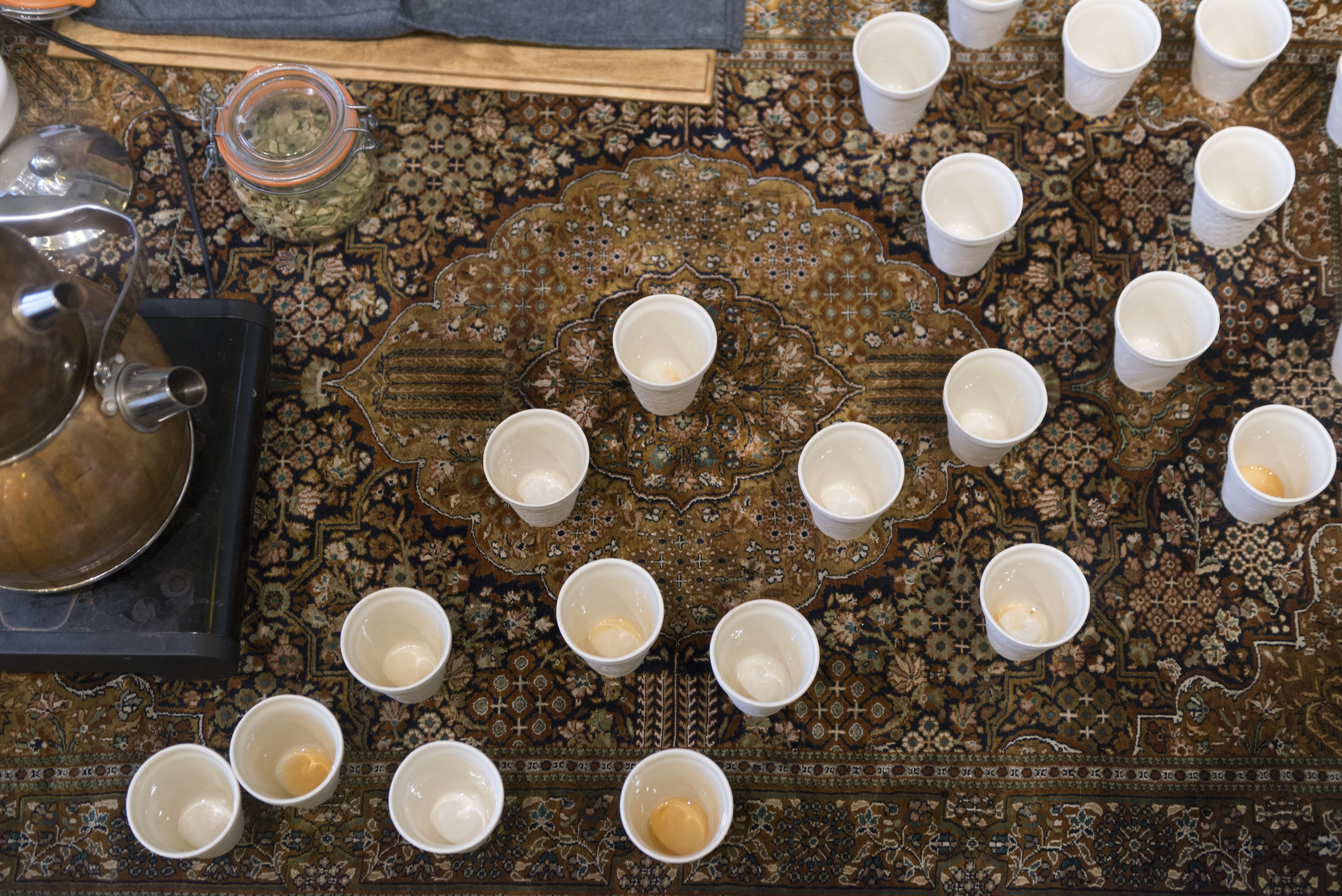 Marking the twentieth year since the opening of the notorious Guantánamo Bay detention camp – a United States military prison used to house Muslim men who were alleged unlawful combatants – artists Aaron Hughes and Amber Ginsburg created 780 cast-porcelain Styrofoam teacups to address Guantánamo's human rights violations. The project is a symbol of solidarity, awareness, and protest. Each porcelain cup is a creative response to the act of resistance by people imprisoned at Guantánamo, whose only means to express themselves, under the weight of systematic torture, was to draw on the surface of their day-to-day Styrofoam cups.