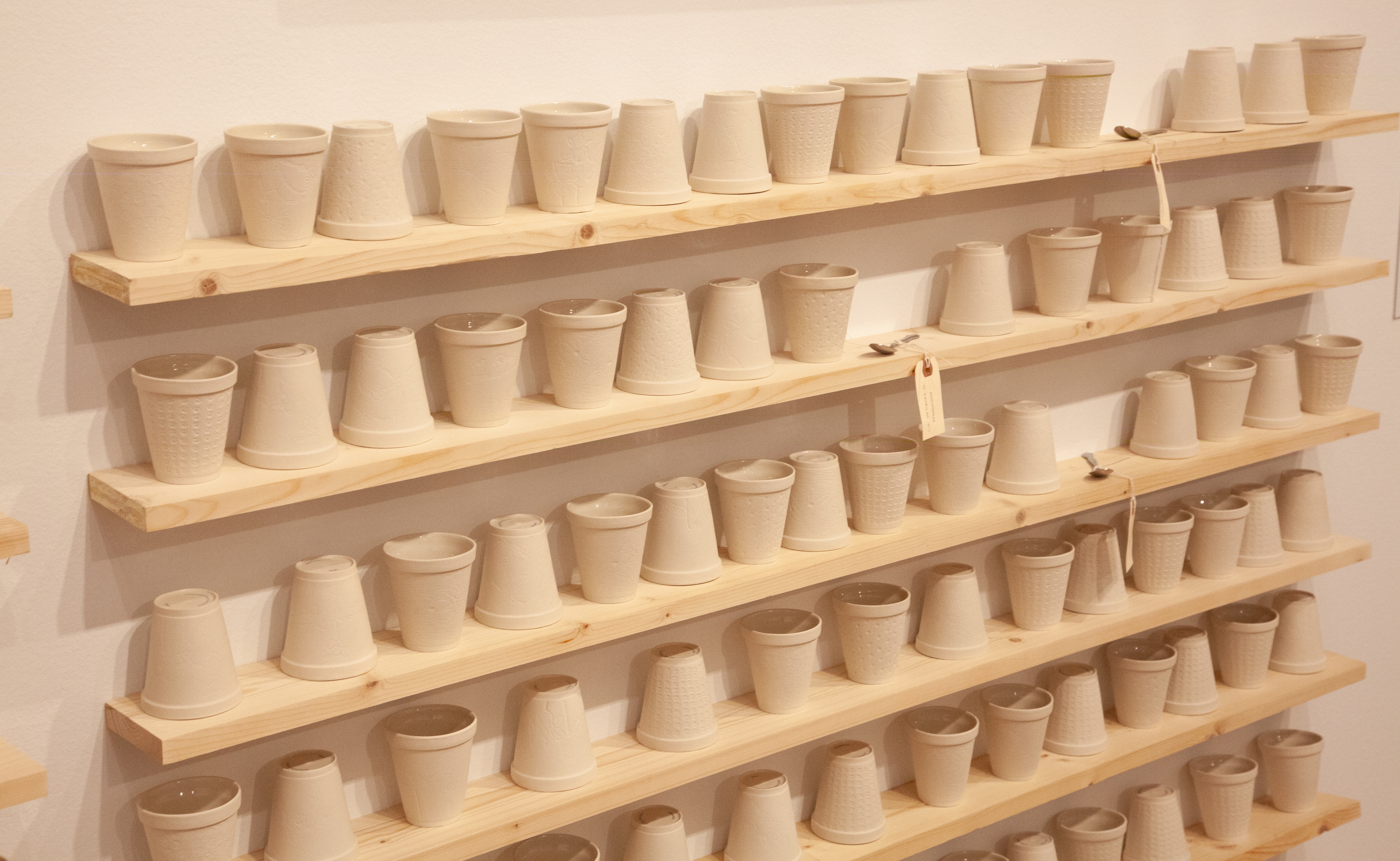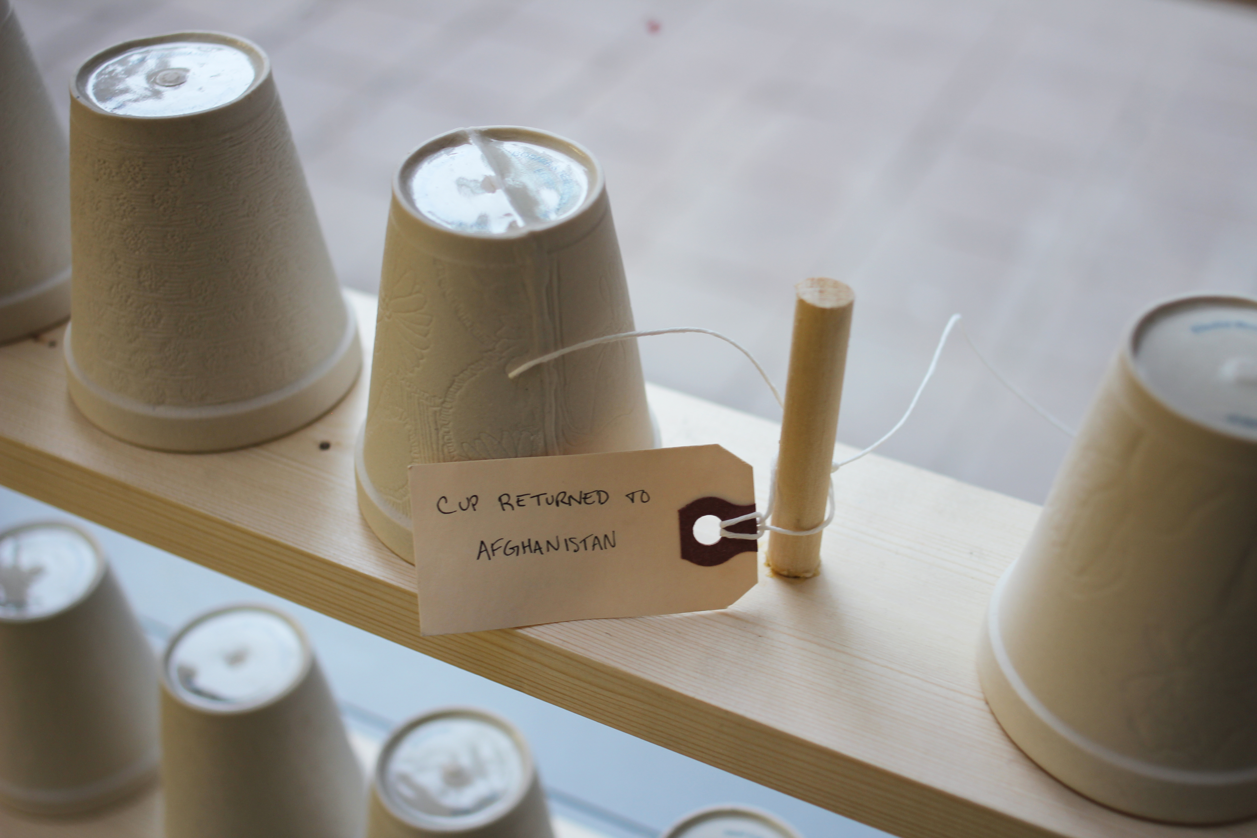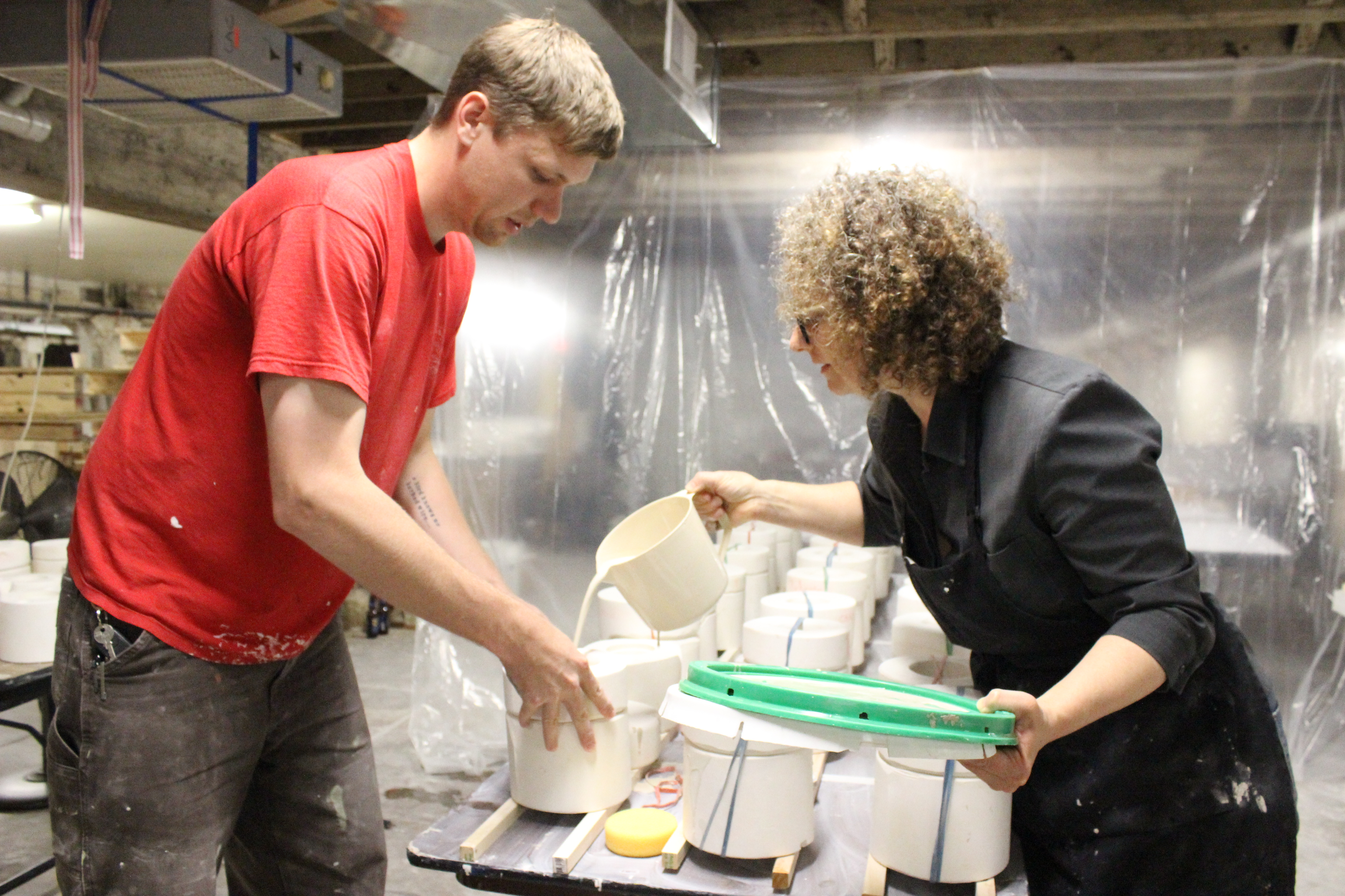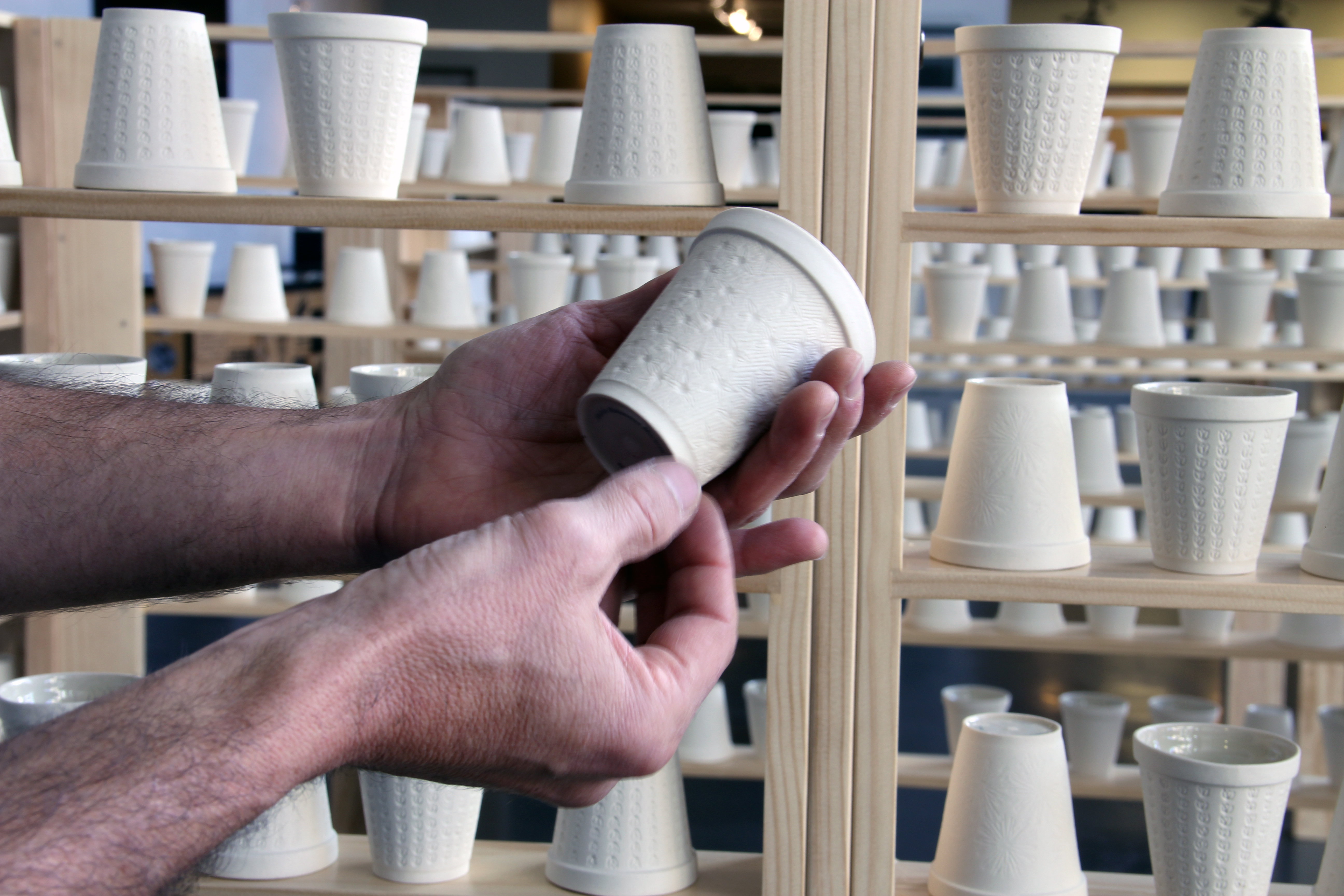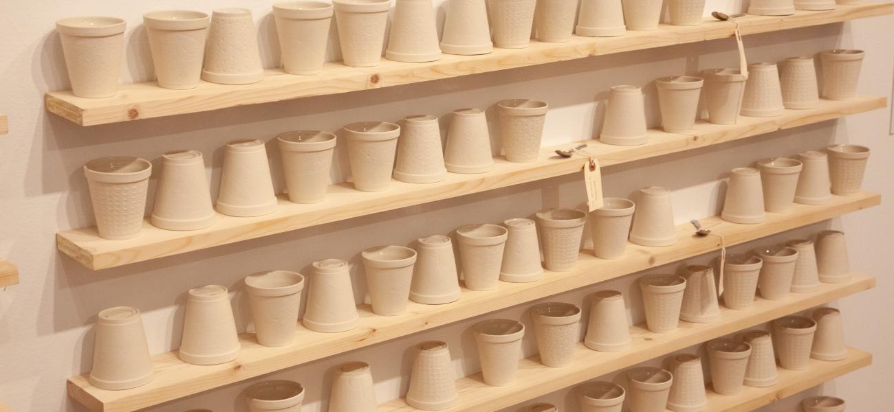 Ginsburg's knowledge of cast-porcelain and background in craft perfectly parallel her interest in social and utopic histories that she translates as research-based multimedia installations. "During a 2014 Lawrence Arts Center Project-Based Artist in Residency, Hughes and Ginsburg, along with many incredible volunteers, opened a cup factory to produce the 780 porcelain Styrofoam cups."[11]
