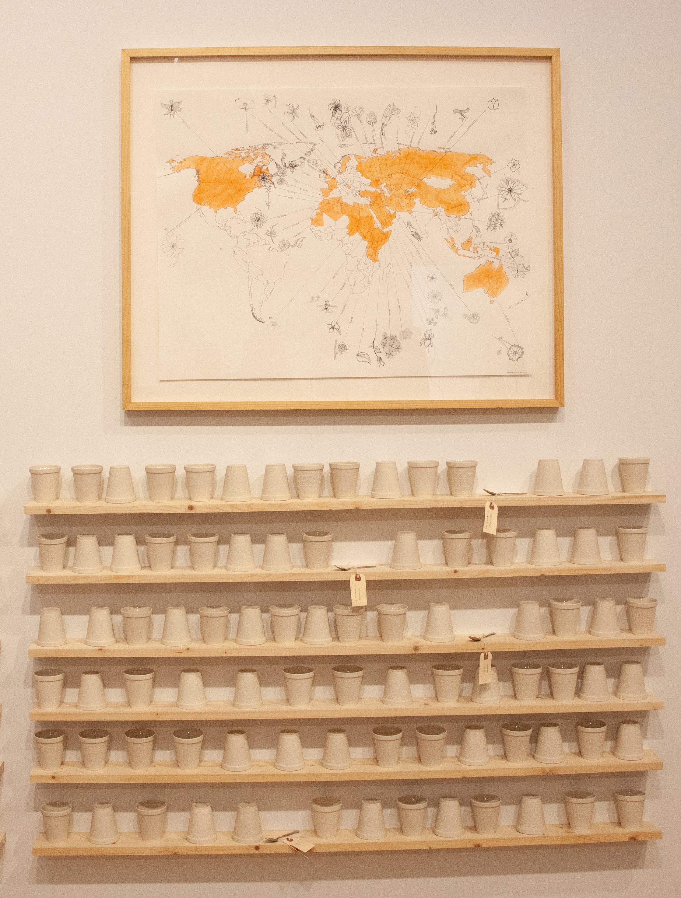 While none of the original Styrofoam cups still exist, the artist Ginsburg creates "site-generated projects and social sculpture that insert historical scenarios into present-day situations."[10] Together Hughes and Ginsburg have masterfully captured the drawn indentions of flowers on Styrofoam for the cast-porcelain cups. Each cup bears the carved outline of a flower on each cup, which is repeated and represents an individual country. Consequently, the repeated flower corresponds to the number of men imprisoned in that specific country. For example, Afghanistan considers the tulip as its national flower; of the 780 cups, there are 220 cups with tulips, and each individual cup has 220 tulips on it to represent all of the 220 Afghan men imprisoned. There are forty-nine countries that have or have had a citizen detained at Guantánamo, and each is represented by a different flower.