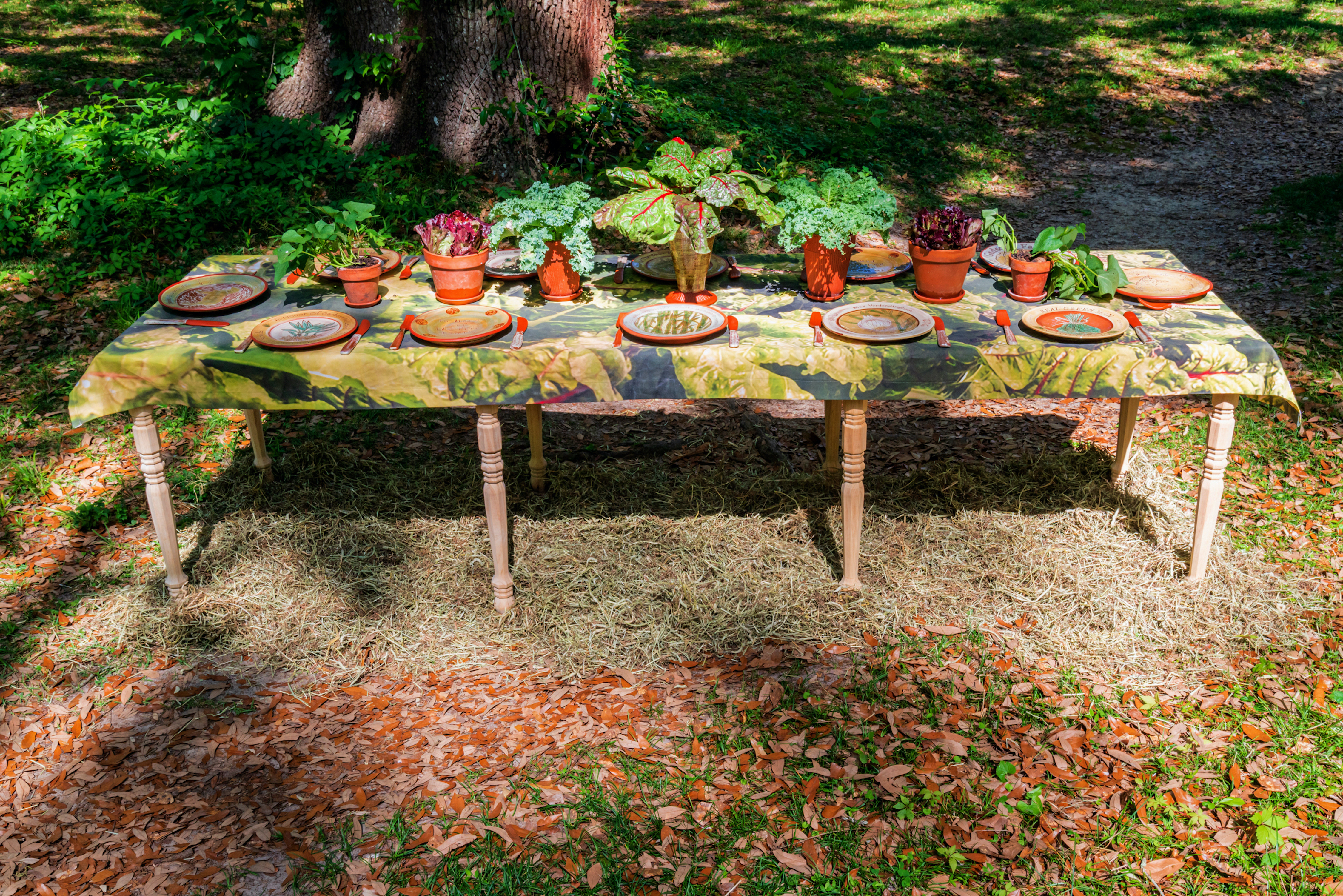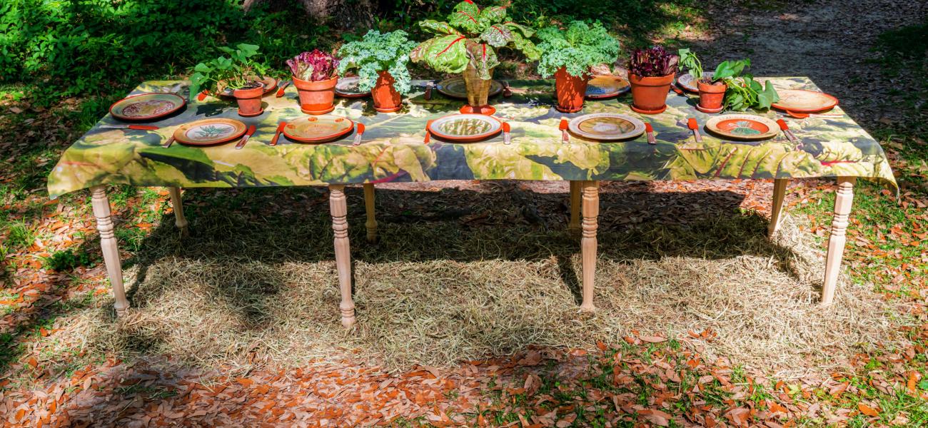 Table installation of "New Histories: The Gadsden Farm Project" under trees. Photo credit: Becki Rutta