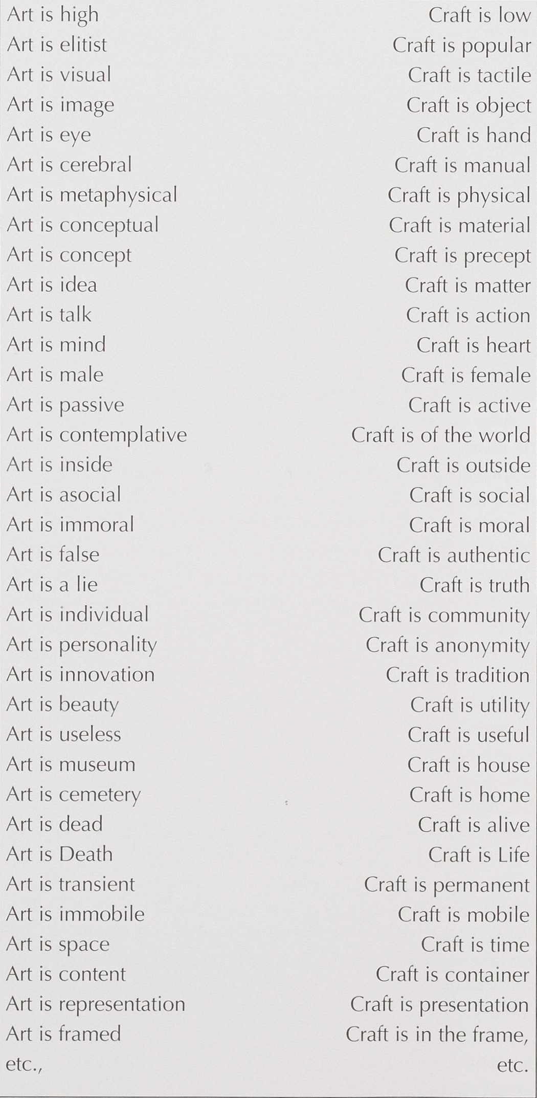 If Art is the umbrella term for all transformative activities, art is any activity or any object, whether existing or yet to be conceptualized or materialized sarcastically, it could be said that art today is anything that looks like art-and we all know what art looks like. Art has reduced itself, it often seems, to its own sign. Interestingly, in its attempts to get closer to life, art has appropriated many craft concepts (function, ritual, domesticity, the relation to touch and the body, etc.), yet still rejects craft productions based on these concepts. Art apparently cannot see the value of these concepts unless they are assimilated into its own conventions - yet the theory or theories of art, while in constant flux, nevertheless cannot or will not make room for craft theory. And craft has so much to contribute to art as a phenomenon.