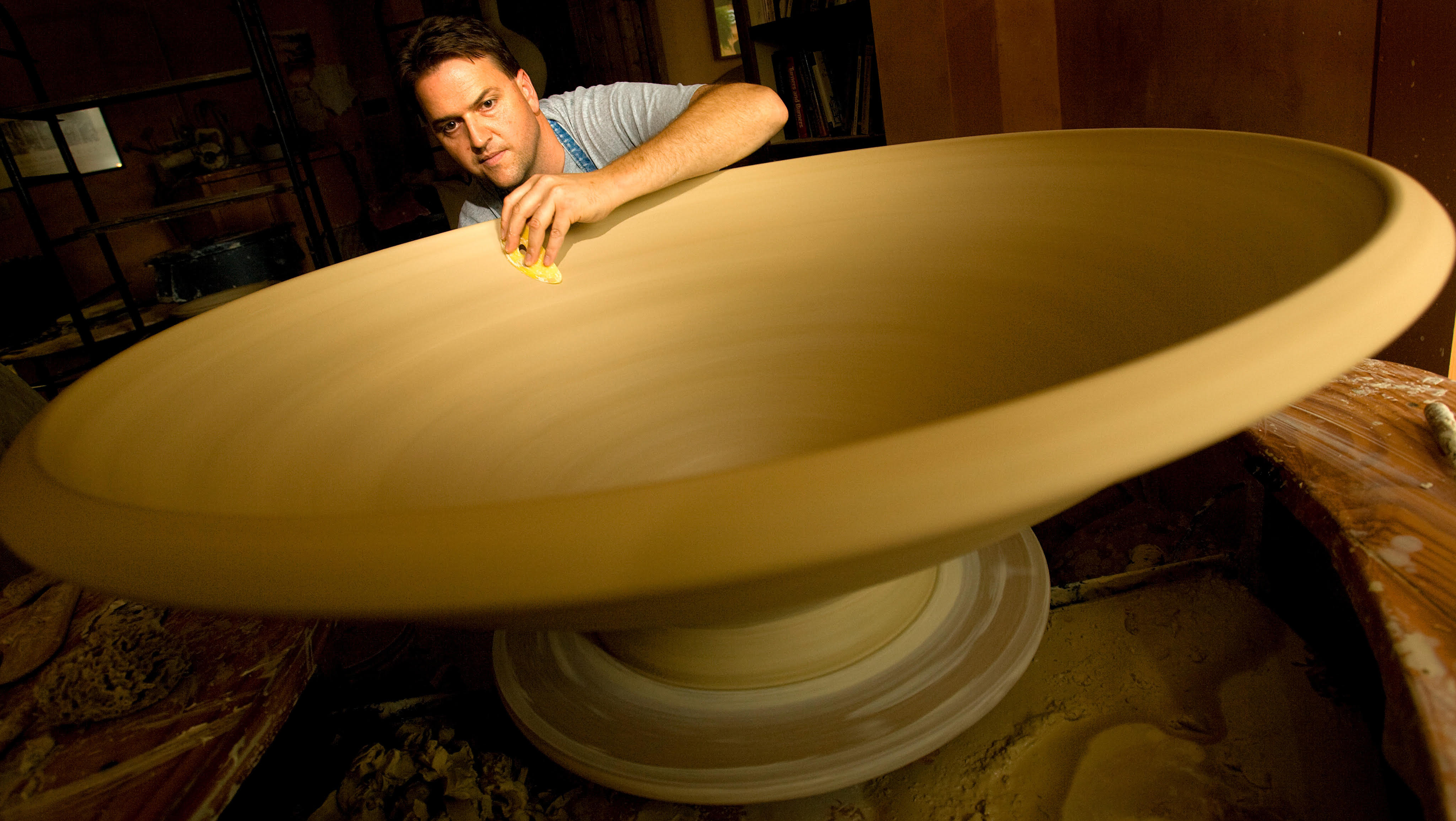 Ben making a large bowl for an installation, 2008. 16x48x48 in. Photograph by Jerry Wolford