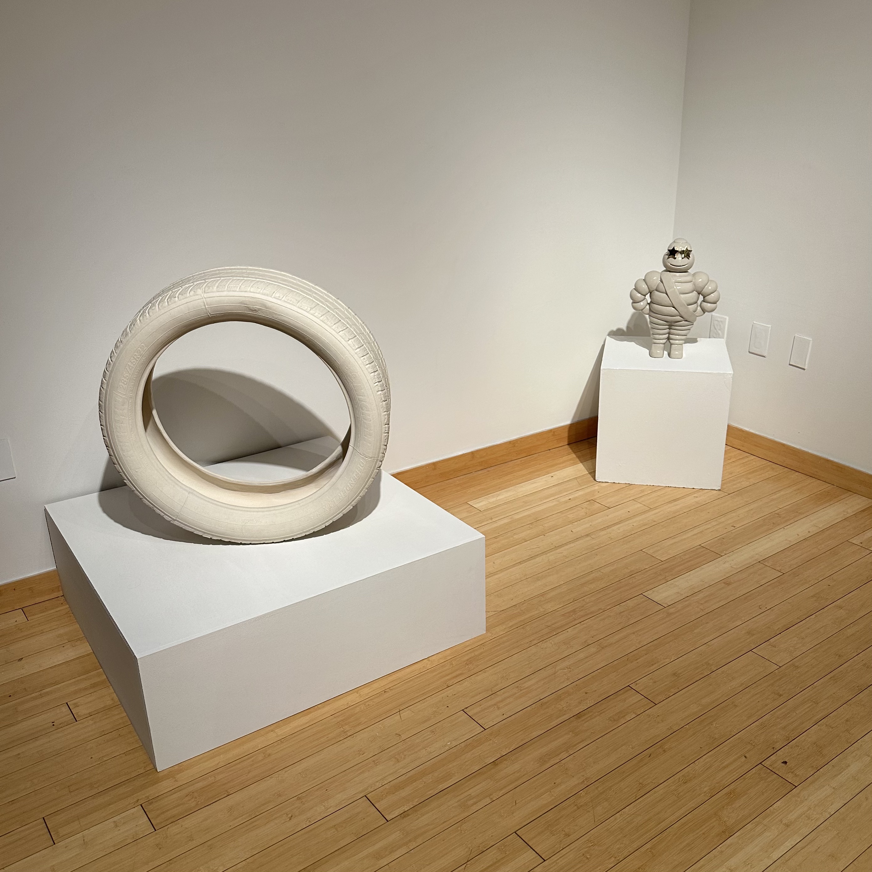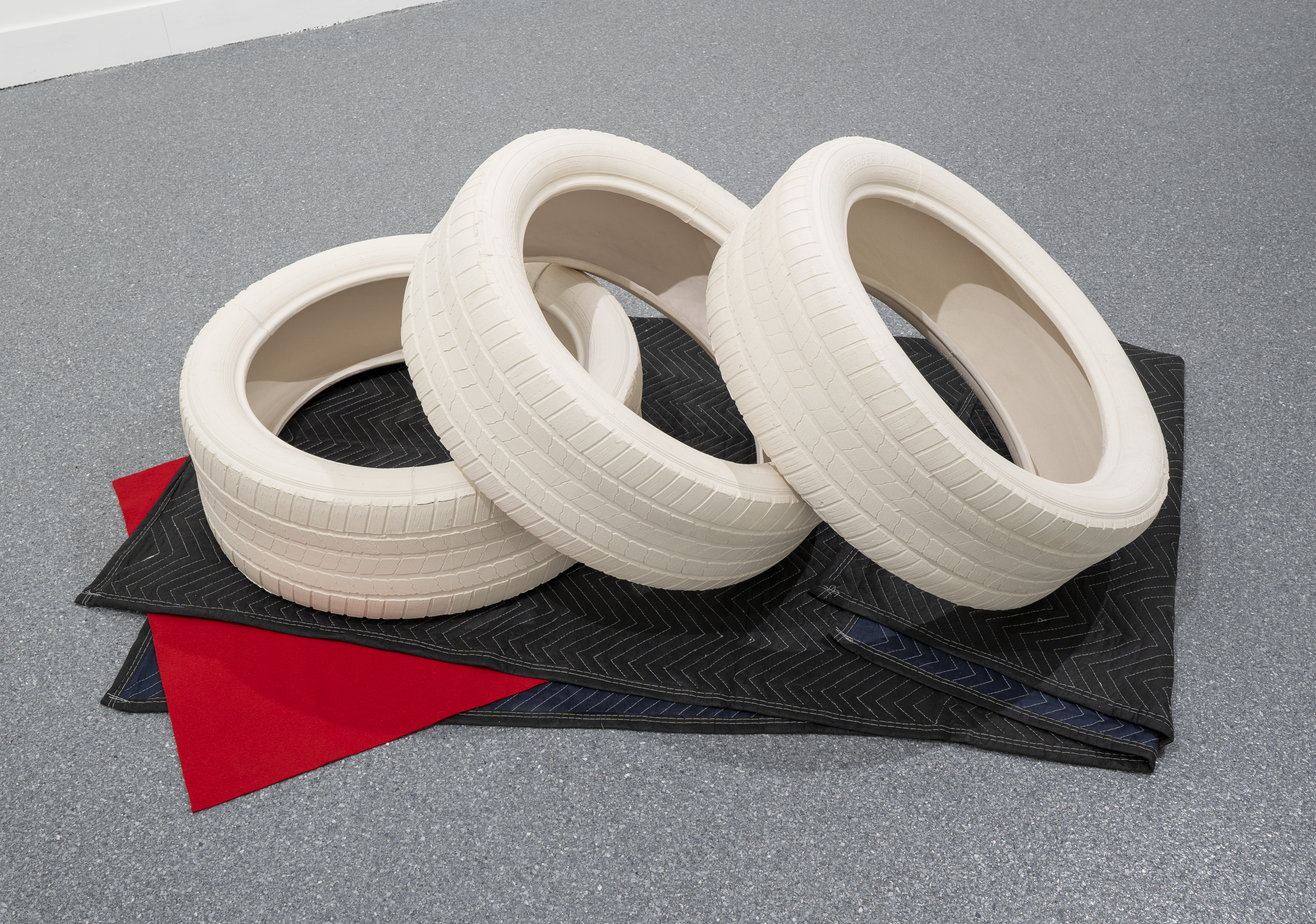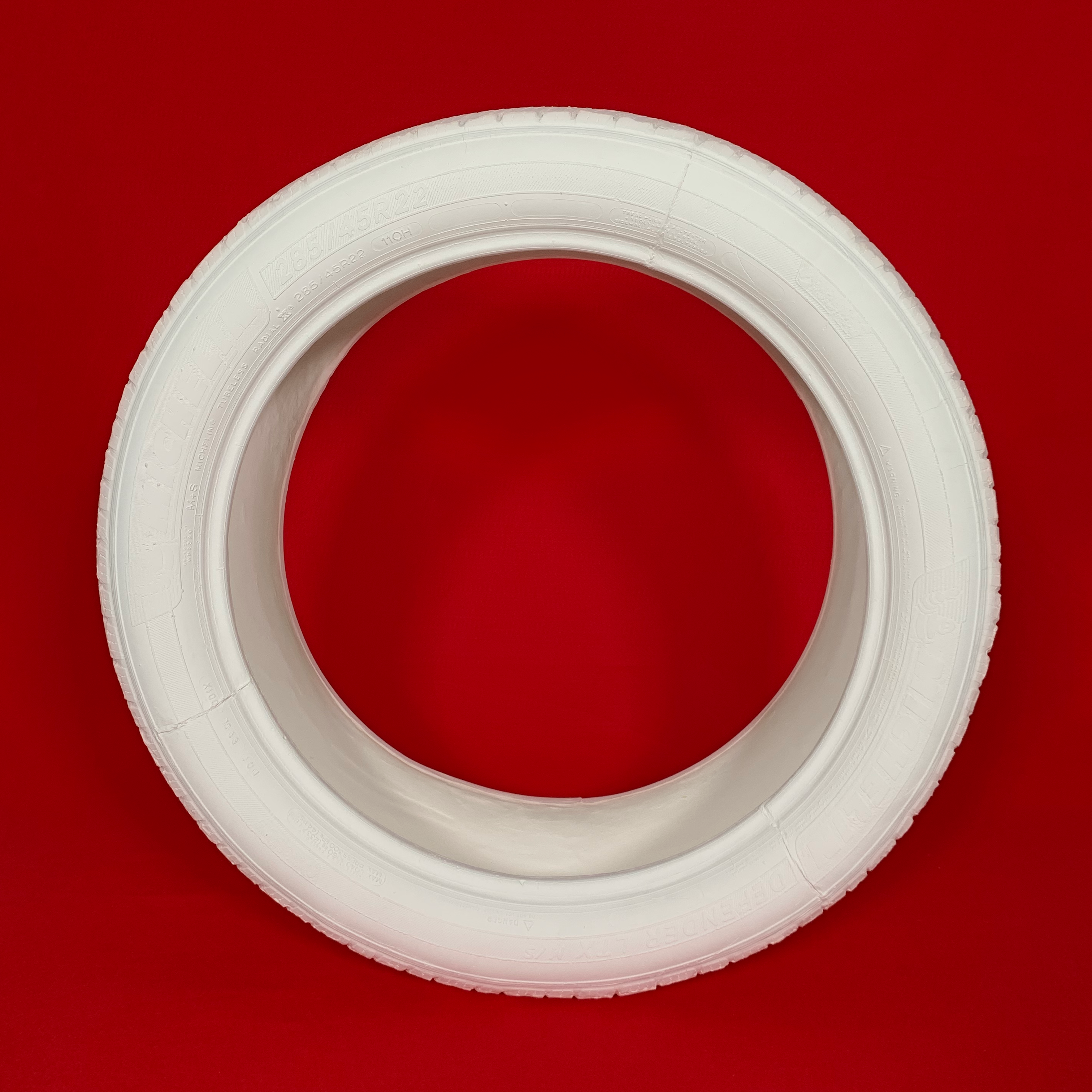 My role as an artist is to be a conduit for these histories. Without contextualization, the artwork presents itself as quiet, docile, and ubiquitous; however, the absence of reference is one of intention. The silent solitude of White Gold reflects a consumer's relationship to violence, labor, material, and history within the tire industry, similar to the way post-colonial structures and commodities undermine our perceptions and relationships to power. The deliberate research, planning, and execution that have formulated the artwork are invisible in the final product to the average passerby. Nonetheless, I take it upon myself to carry this knowledge and exert the labor necessary to construct these forms and share this information. As a Vietnamese American, my existence is tethered to the colonial and imperial forces imposed on my mother's homeland. My appropriation of the patented Michelin tire subverts intergenerational power dynamics inherent in my existence. I insert myself into this lineage of resistance not to center my experience but to act as an entry point to a much more extensive history.